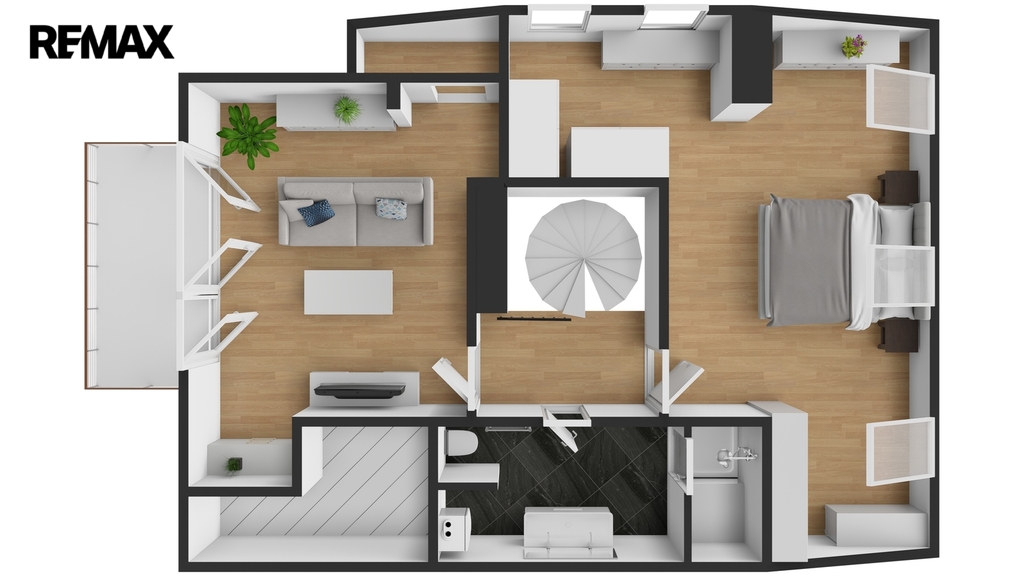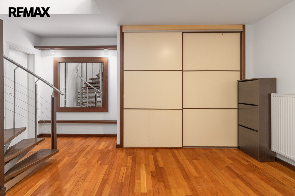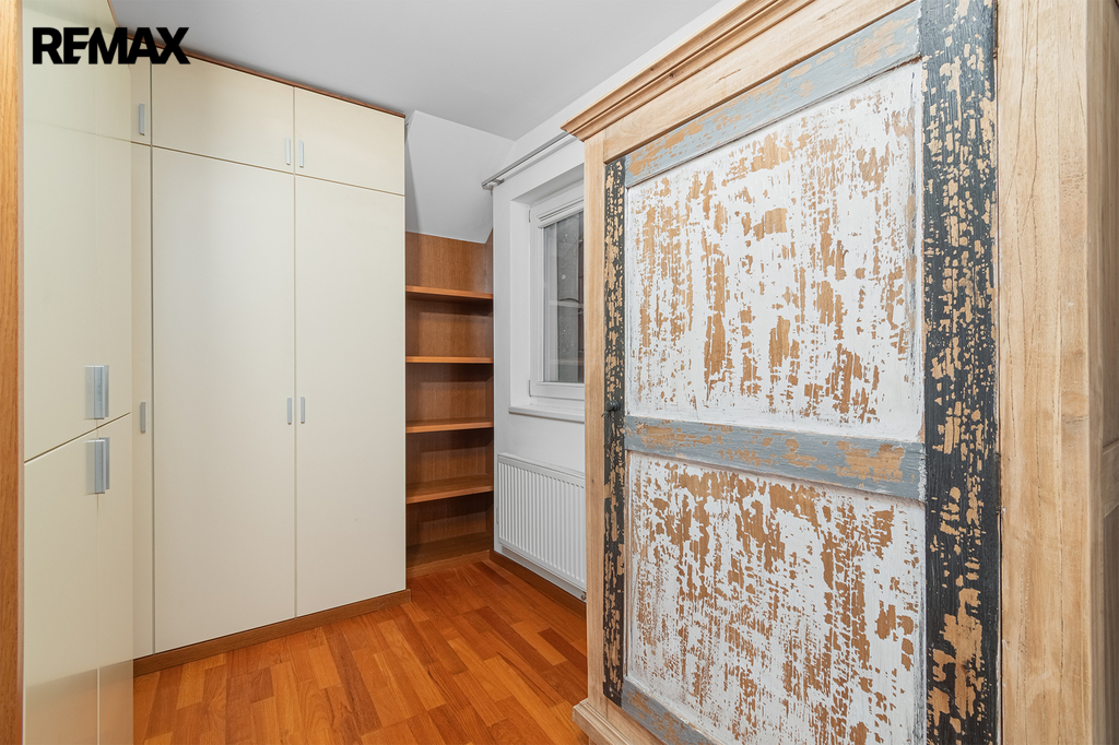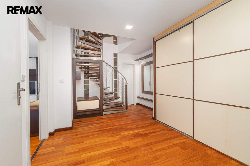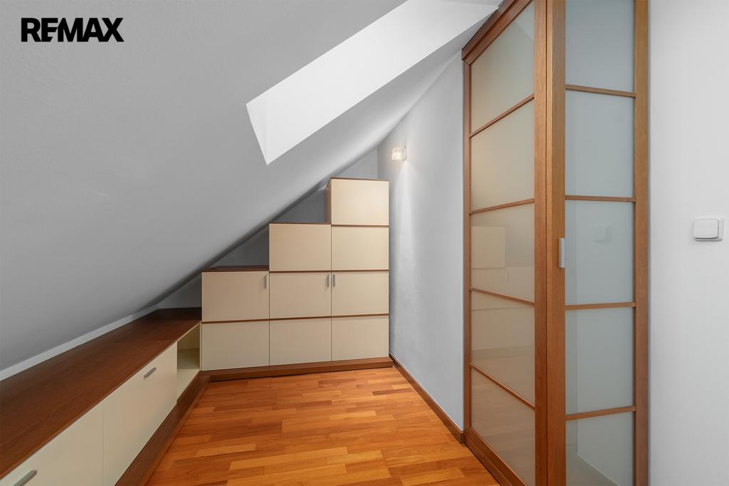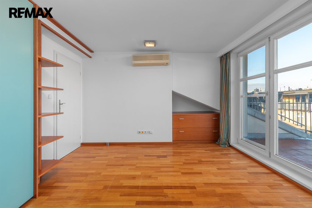Po schodišti se dostanete do horního patra, které je pojato jako klidová zóna poskytující maximální soukromí a klid. Nachází se zde ložnice se šatnou a další samostatný pokoj, ze kterého je francouzským oknem přímý vstup na terasu, s výhledem do klidného vnitrobloku. Ideálně je tak rozšířen užitný prostor bytu, který se stává místem, kde může den začínat ranní kávou a končit klidným večerním posezením. Maximální pohodlí pak zajišťuje druhá koupelna se sprchovým koutem a toaletou.