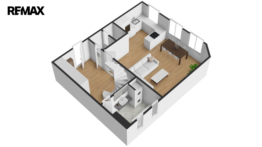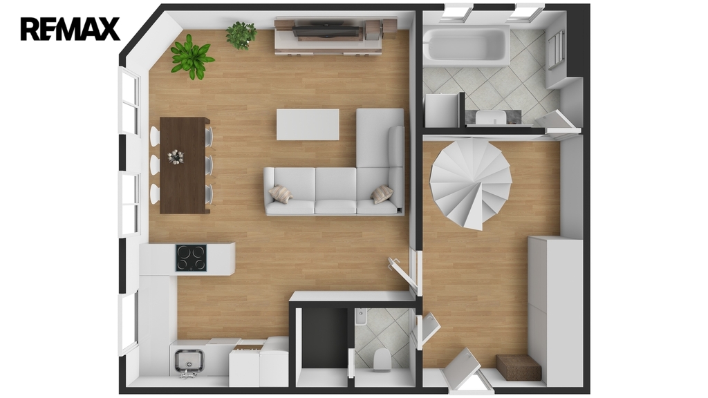Srdcem spodního patra je prostorný obývací pokoj s kuchyňským koutem a jídelní částí, na kterou navazuje zóna pro relaxaci a odpočinek. Součástí tohoto patra je dále koupelna s vanou a místem pro pračku se sušičkou, samostatná toaleta a vstupní hala, která již při příchodu podtrhuje vzdušnost a charakter celého bytu.