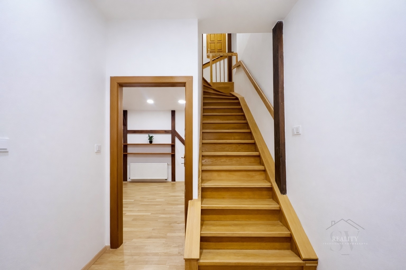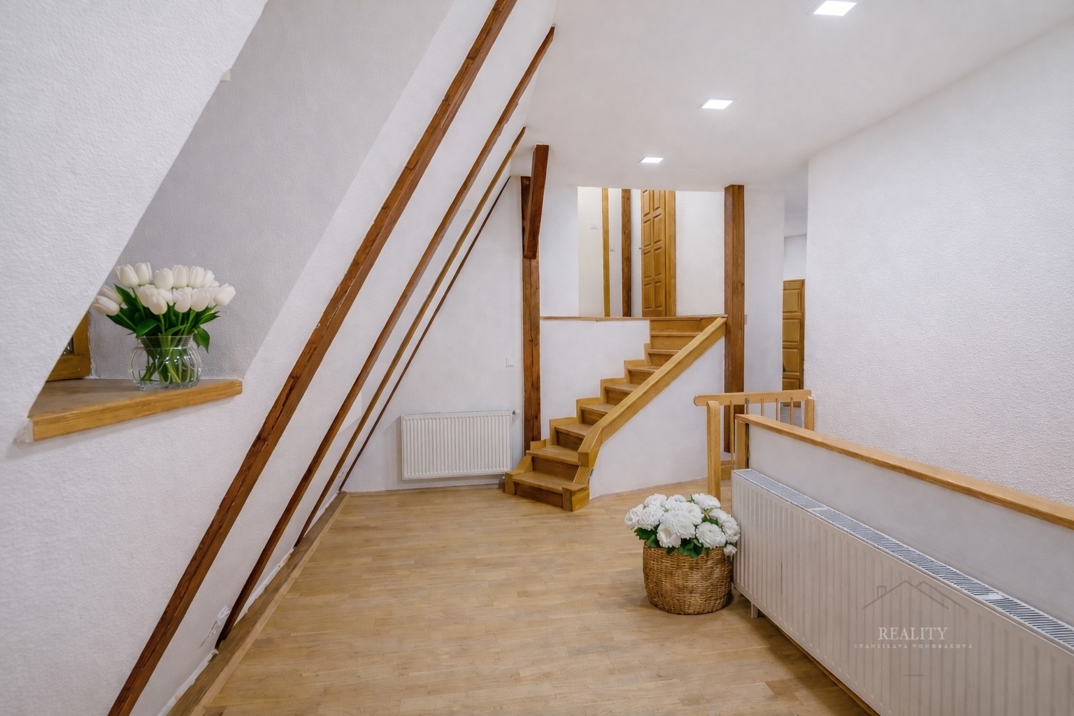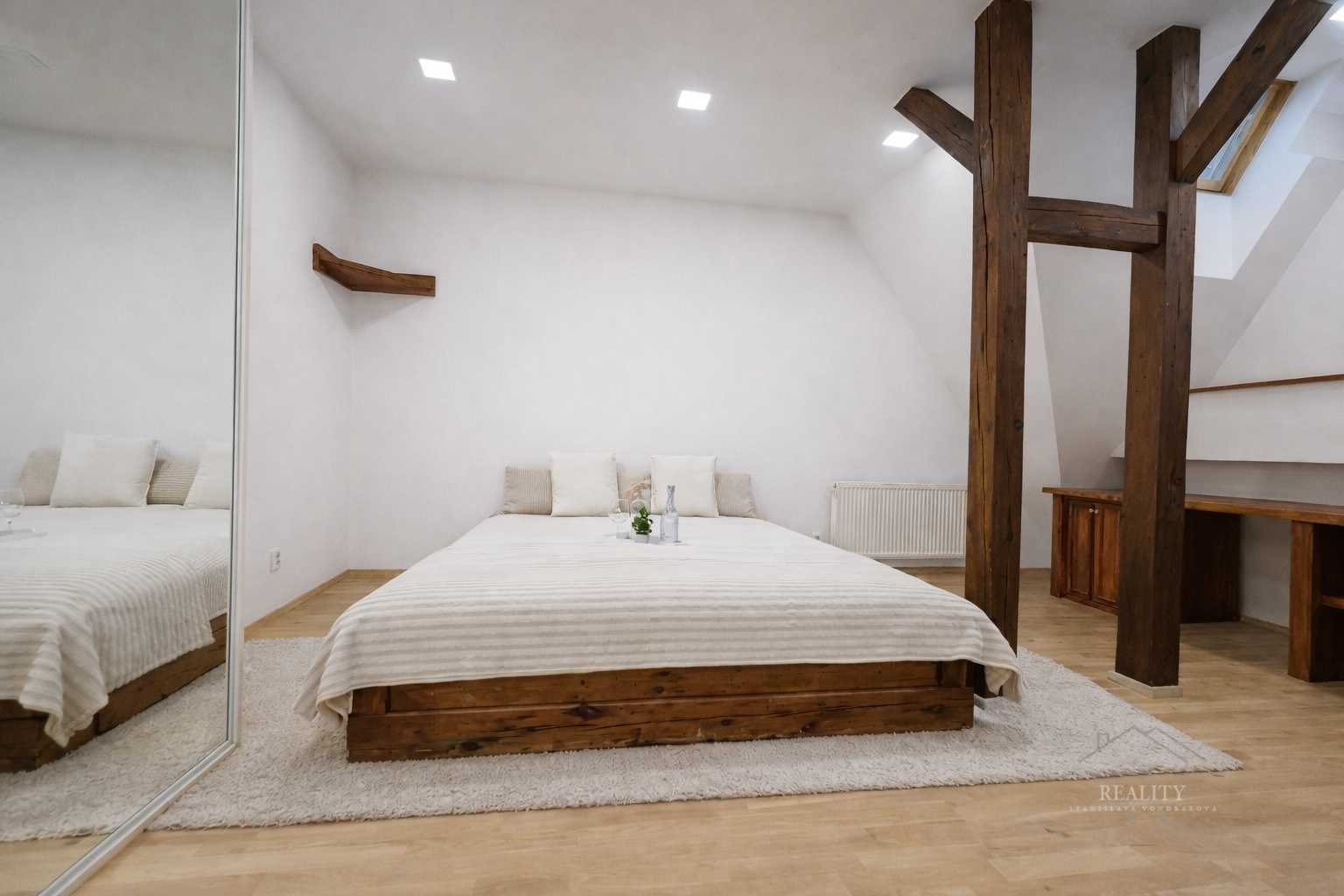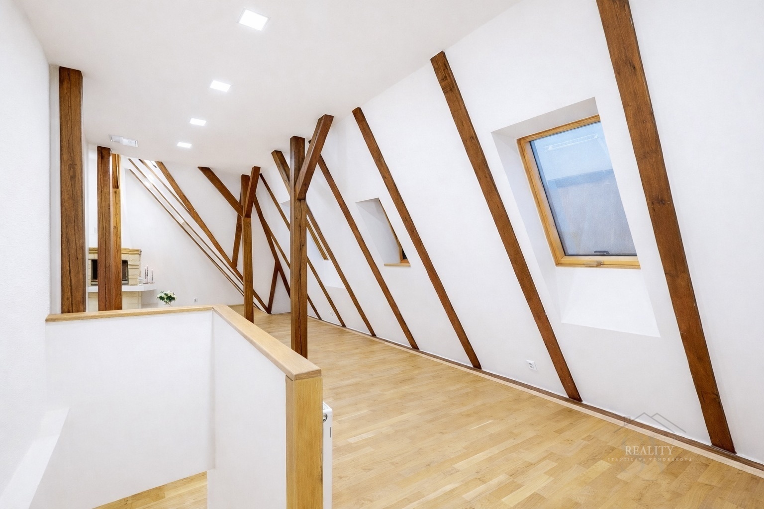 Velkorysý podkrovní obývací prostor s krbem, kuchyňským koutem, přiznanými historickými trámy a přímým vstupem na terasu. Krb zde tvoří výraznou dominantu interiéru a zároveň plní funkci doplňkového zdroje tepla.