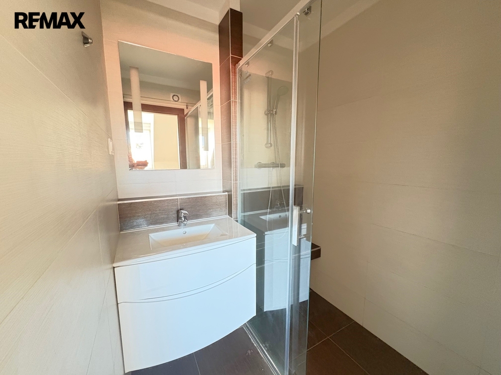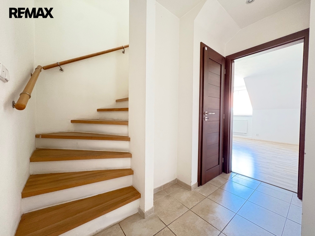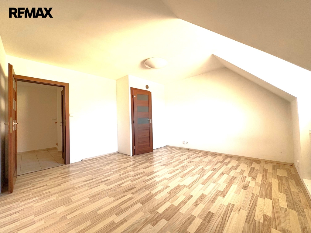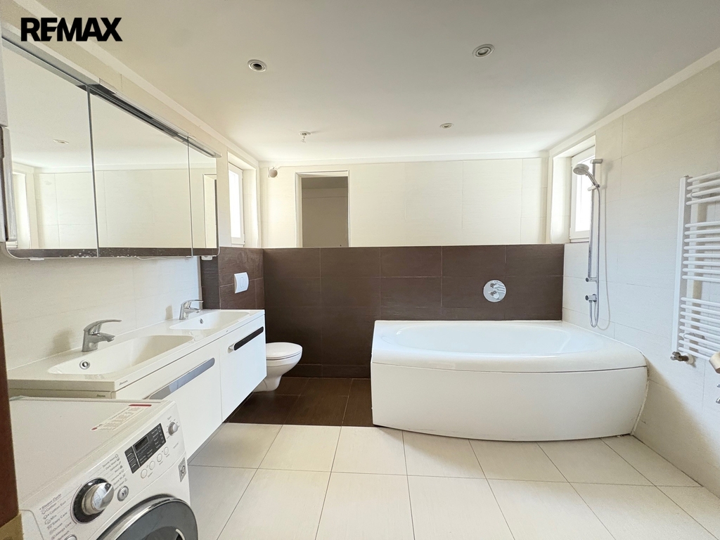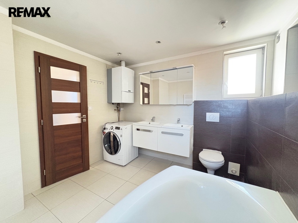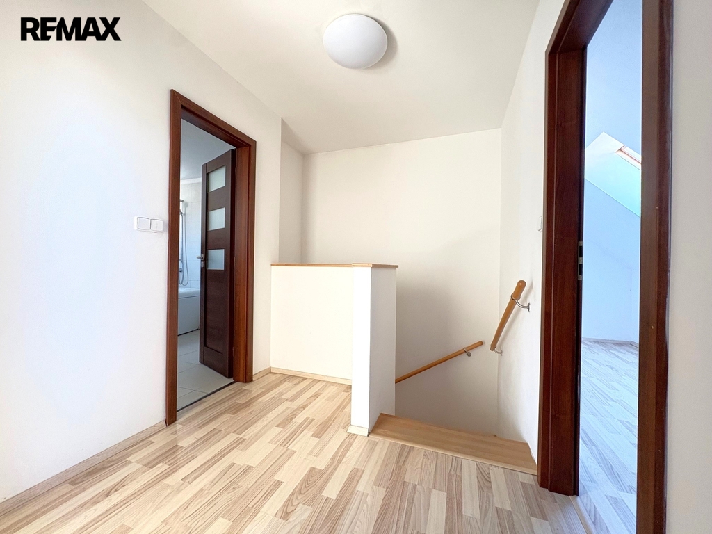V patře se nachází tři samostatné pokoje a druhá velká koupelna s vanou, 2 umyvadly a WC.