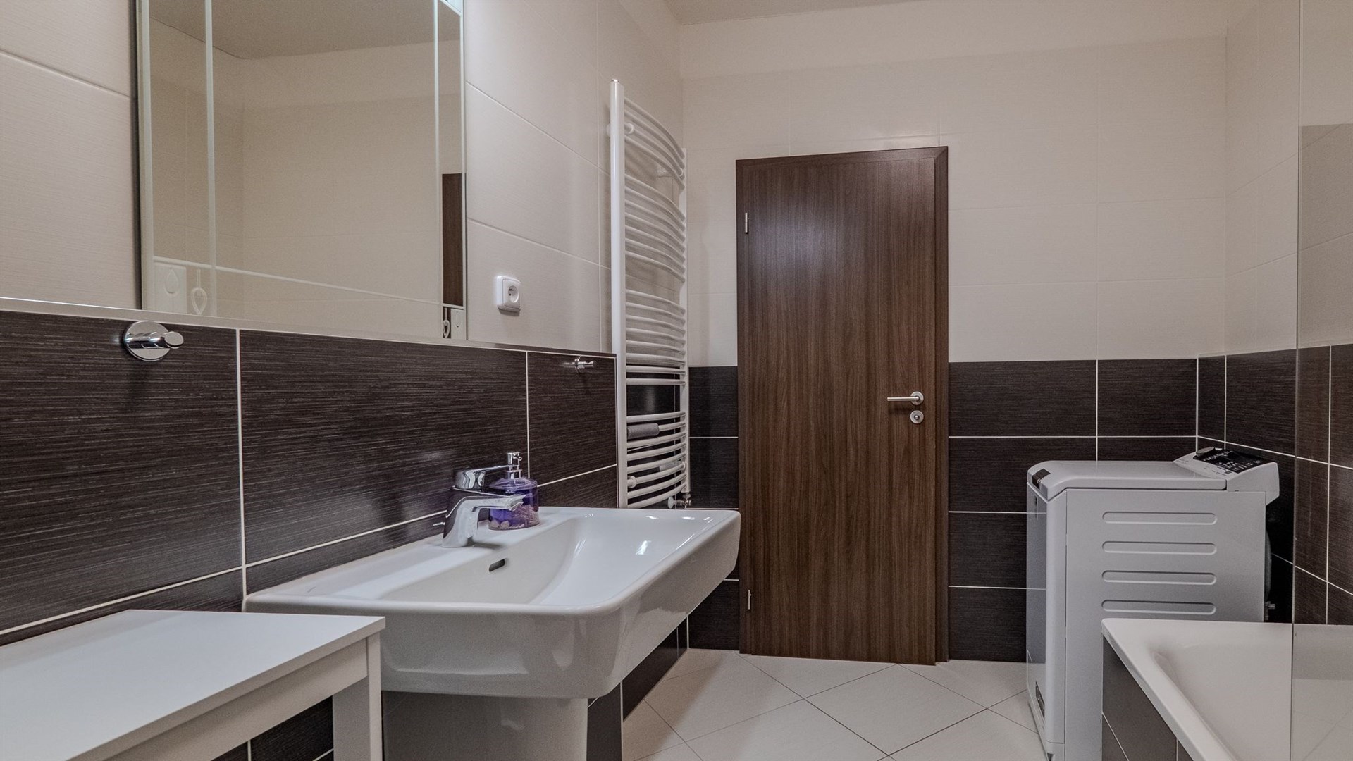 Moderní koupelna s vanou a WC byla zhotovena z kvalitních materiálů.