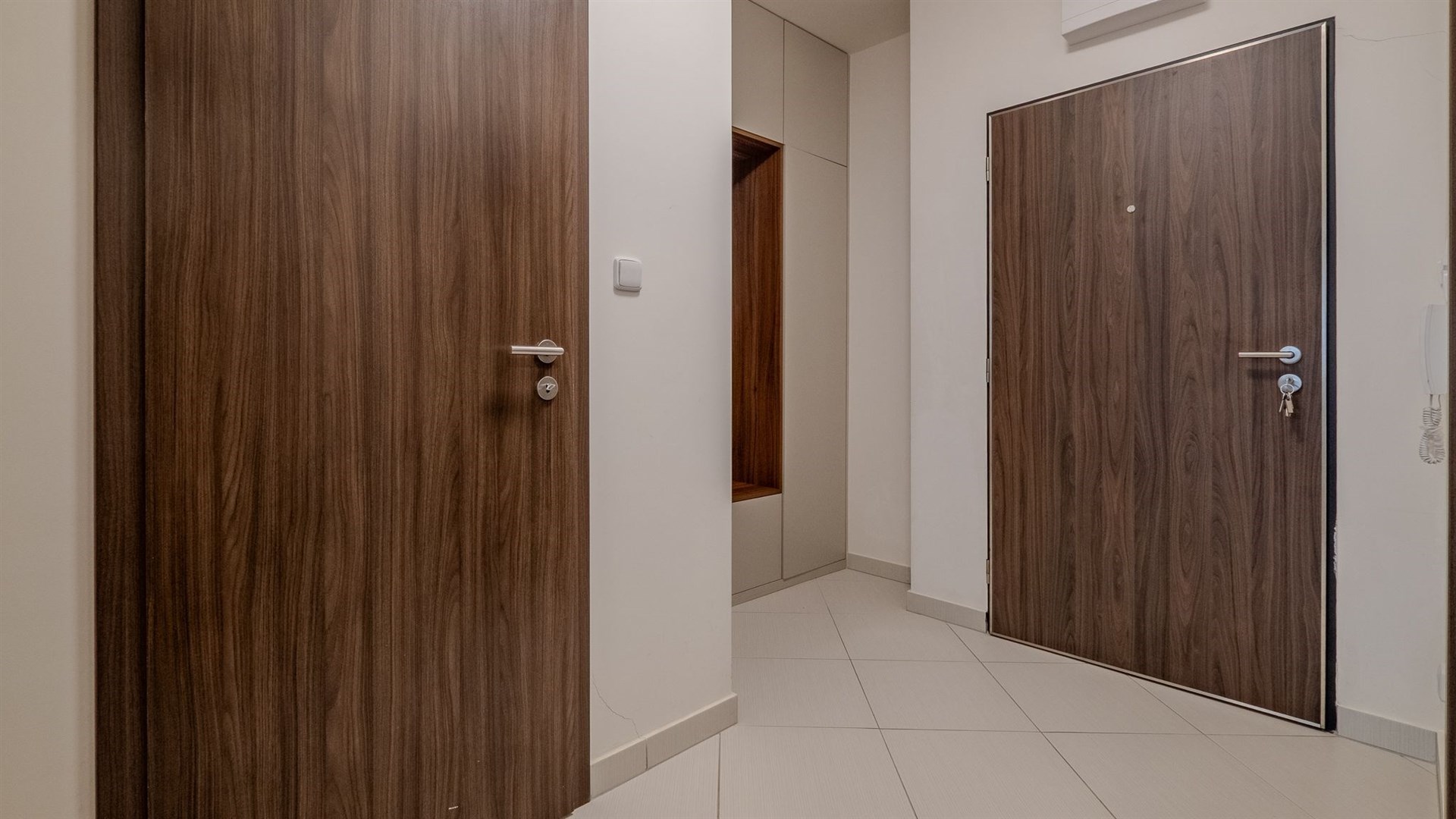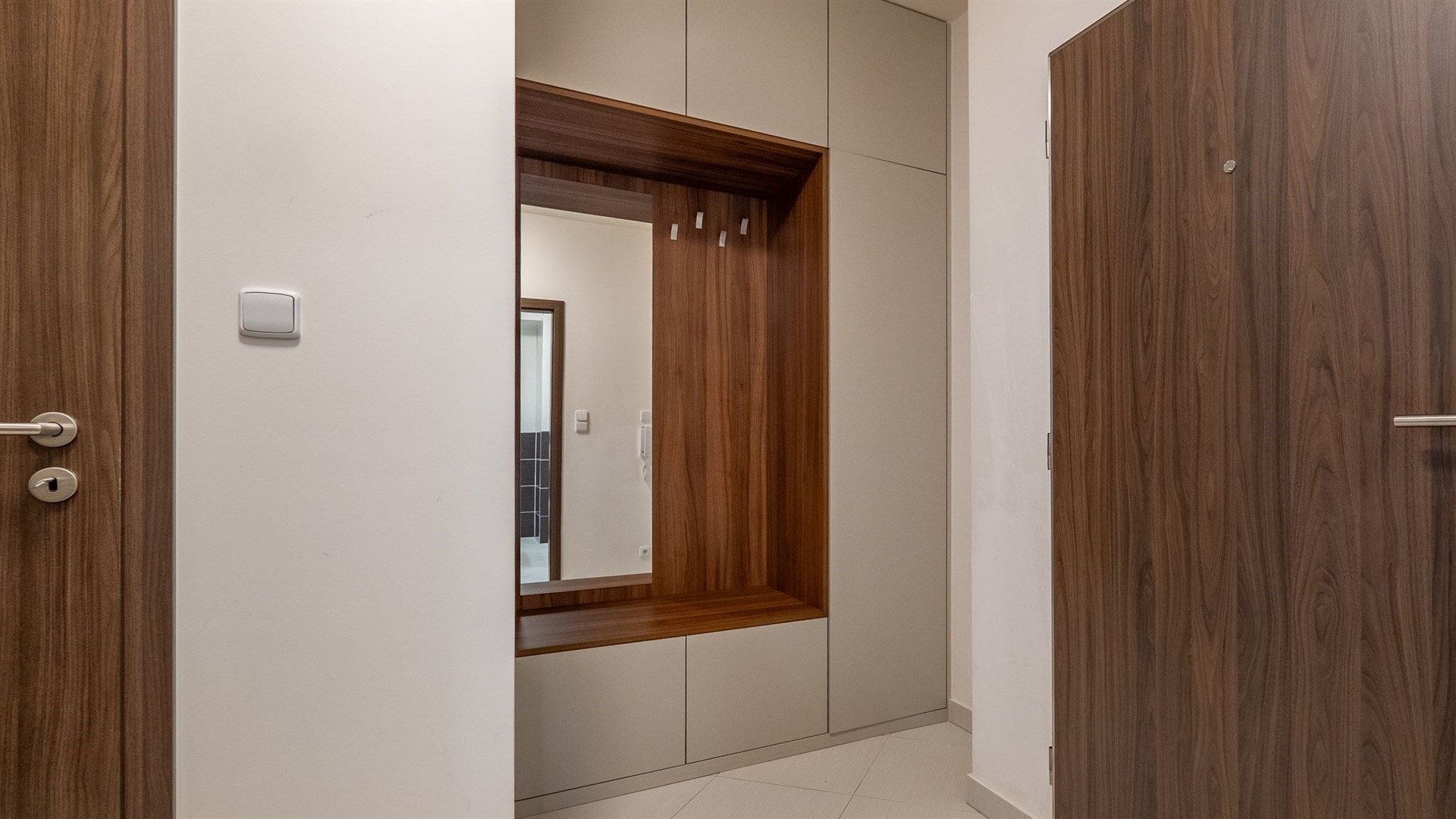 Chodba má dostatek úložných prostor, je zde vstup do komory a další vestavěná skříň na míru.