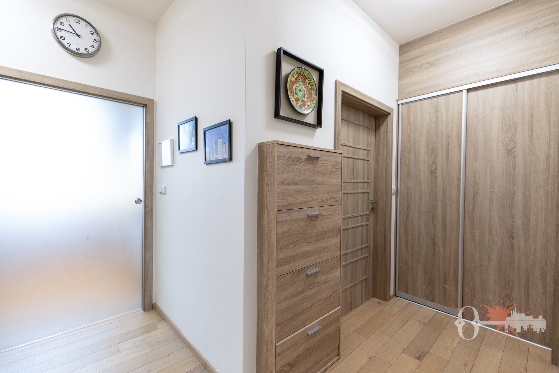 Interiér působí svěže a útulně díky dřevěným podlahám z běleného dubu, které dodávají prostoru lehkost a nadčasovost. Kuchyně pochází od výrobce, pro kterého je kuchyně skutečným srdcem každého domova, a je navržena tak, aby přinášela radost z vaření i společných chvil. Vestavěné skříně na míru nabízejí úložné prostory, které dokonale respektují dispozici bytu a budí příjemný pocit pořádku a elegance. Koupelna je vybavena kvalitní sanitou od uznávaného německého výrobce a v bytě nechybí ani moderní radiátory s termostaty, díky nimž lze snadno navodit příjemné klima.