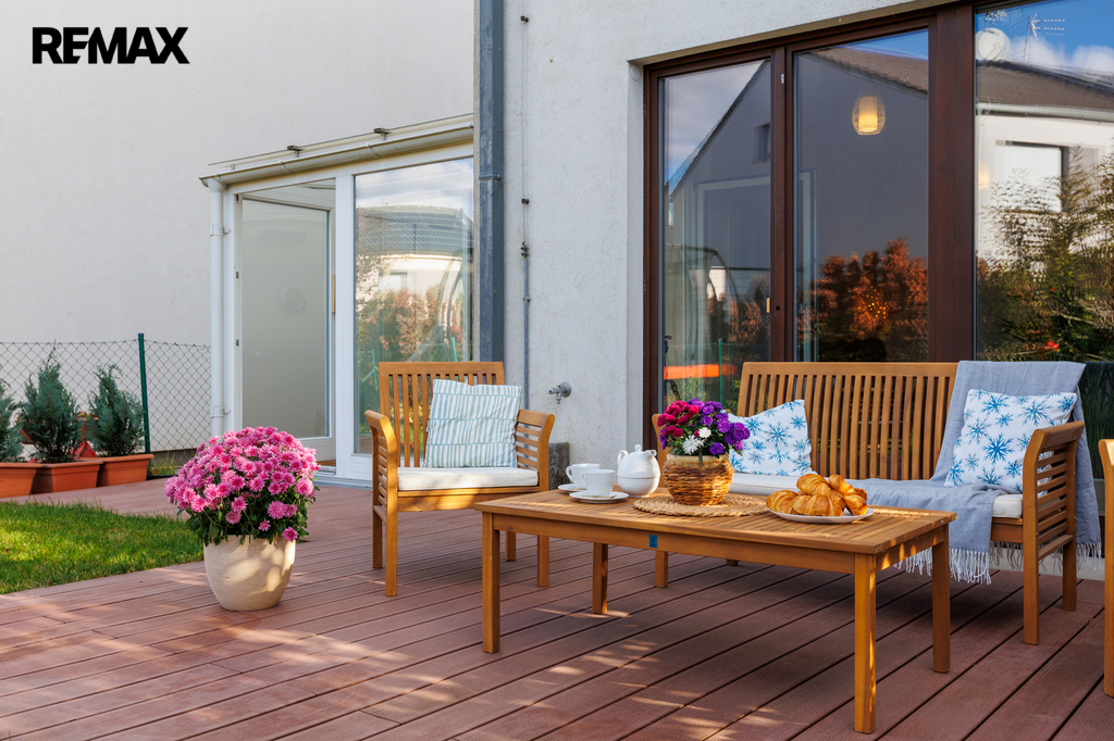 - Terasa se dvěma vstupy; ovocná zahrádka