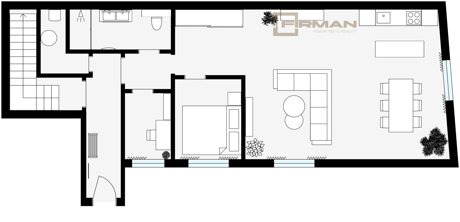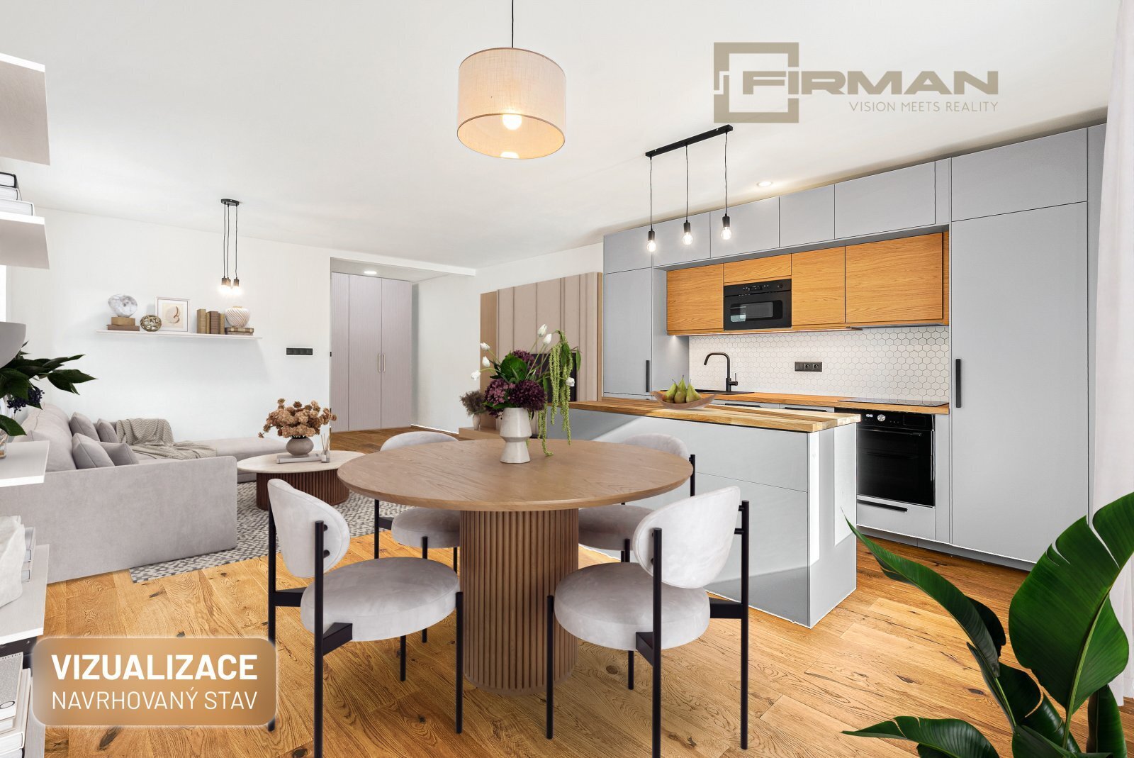 Dispozice nabízí komfortní obývací prostor s novou moderní kuchyní, která plynule navazuje na zbytek bytu a vytváří přirozené centrum dění. Samostatná ložnice je klidnou zónou pro odpočinek a soukromí a pracovna pak přináší praktické zázemí pro home office, kreativní činnost nebo úložný prostor navíc – podle vašich potřeb.