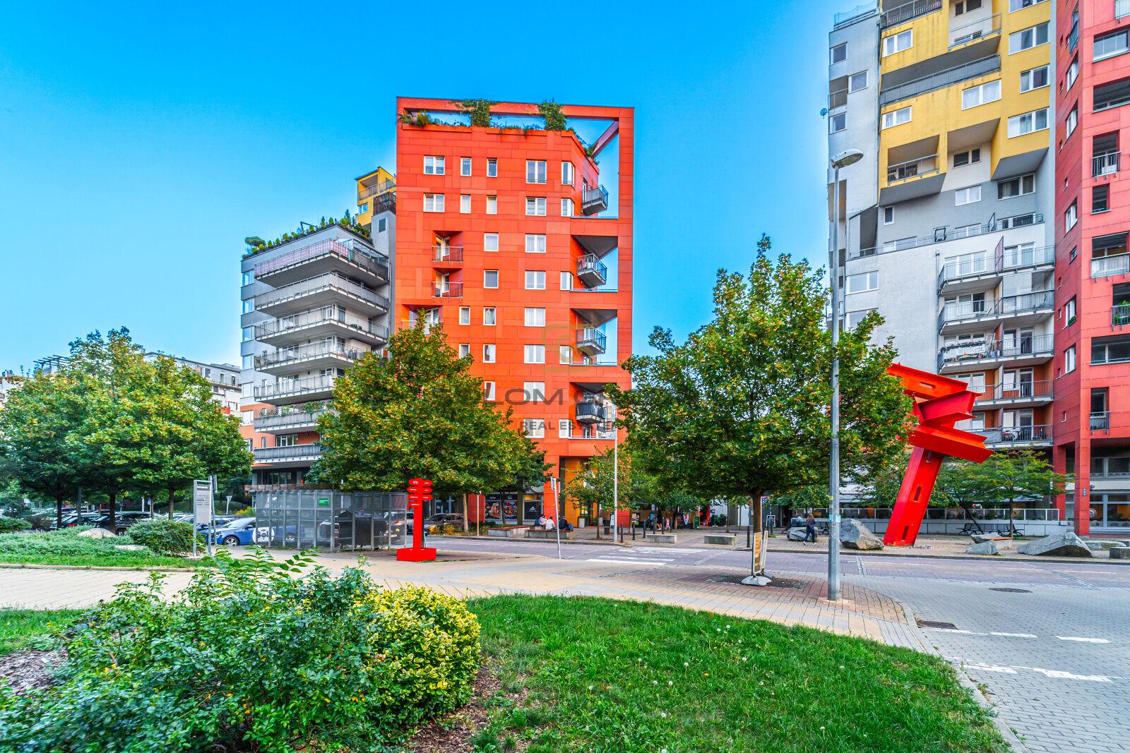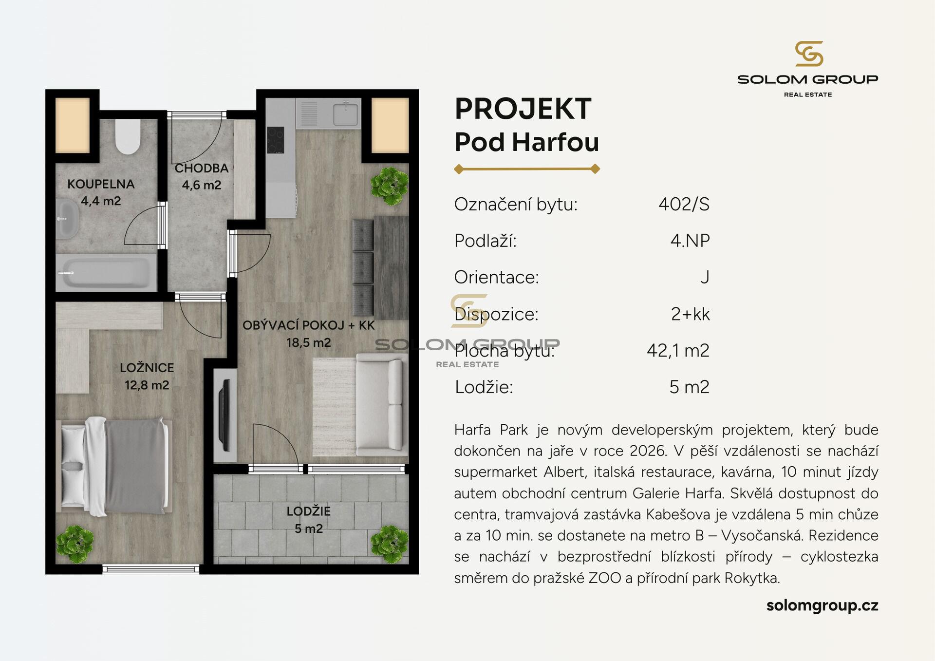 Prodej nového bytu 2+kk, 47,1 m² (byt o výměře 42,1 m² + lodžie o výměře 5 m²), který se nachází ve 4. NP cihlové novostavby v rezidenci Harfa Park, Praha 9 – Vysočany (Dům S)