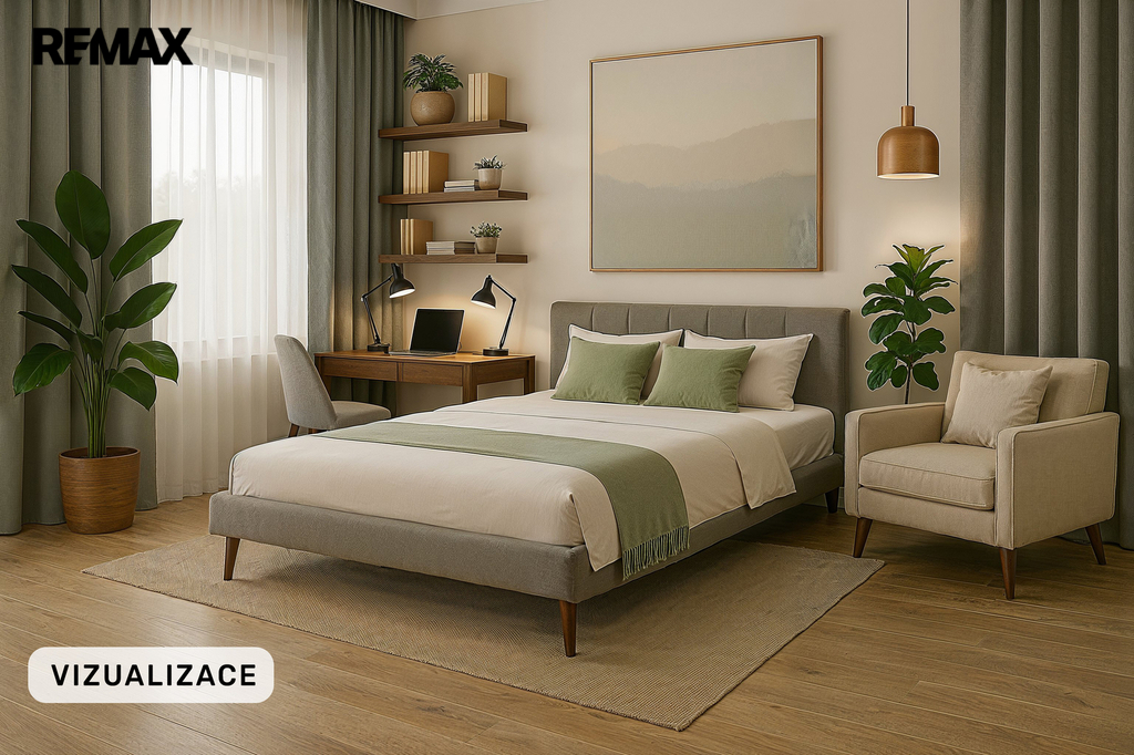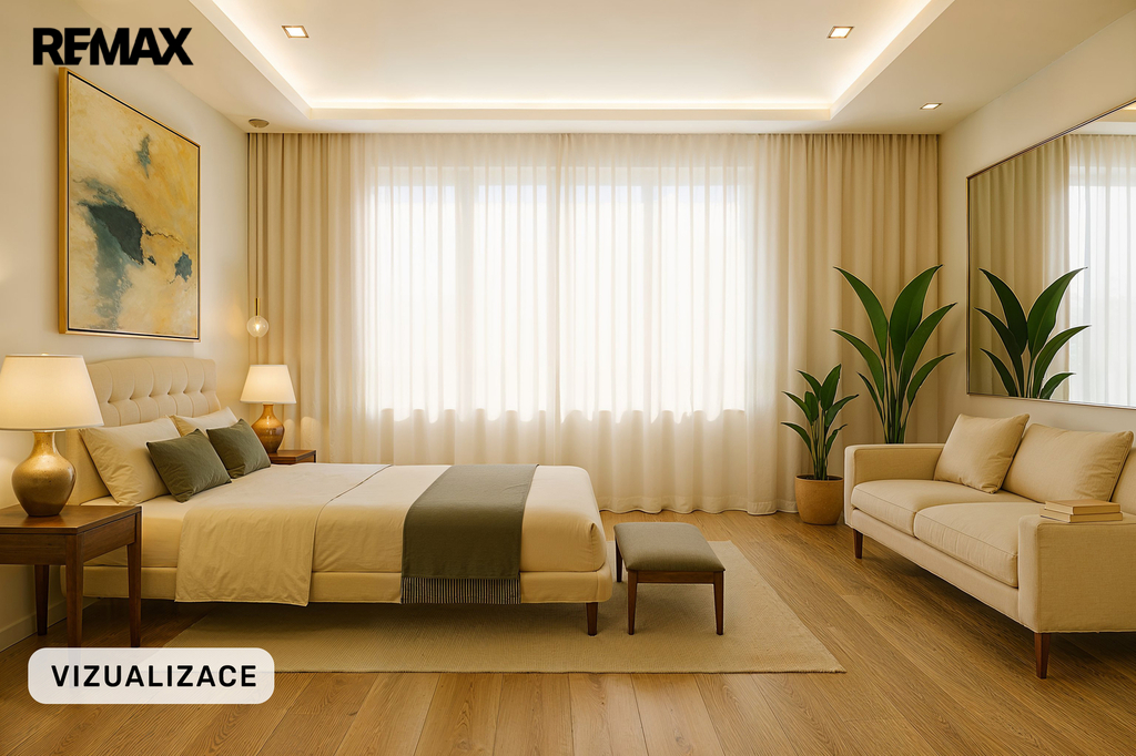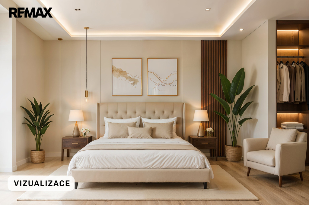 - hlavní ložnice se šatnou a soukromou koupelnou (sprchový kout, WC)