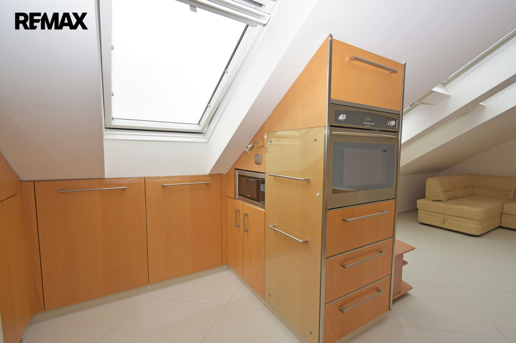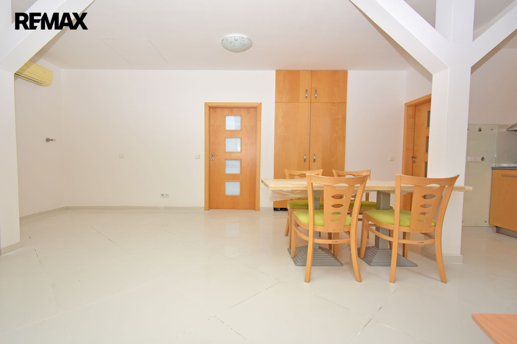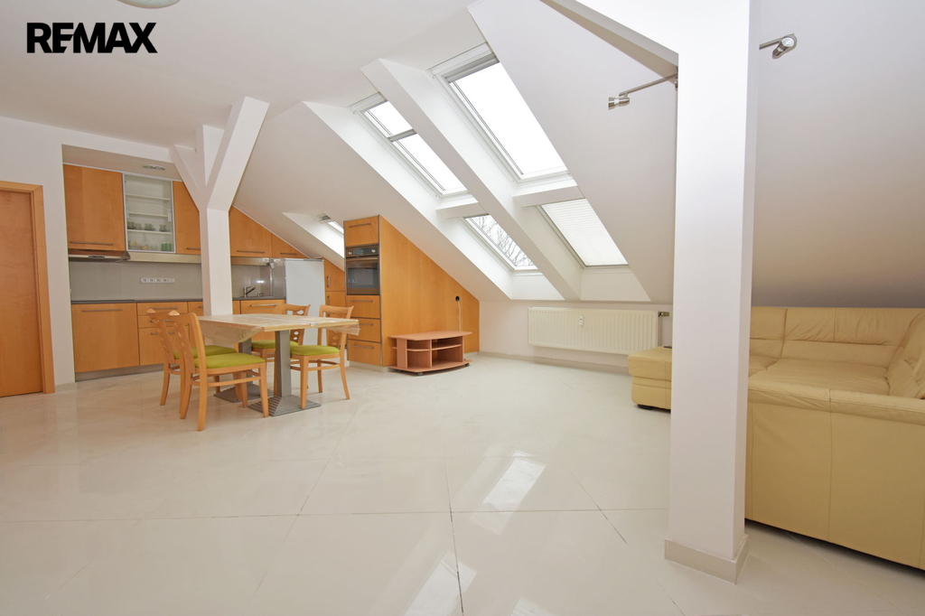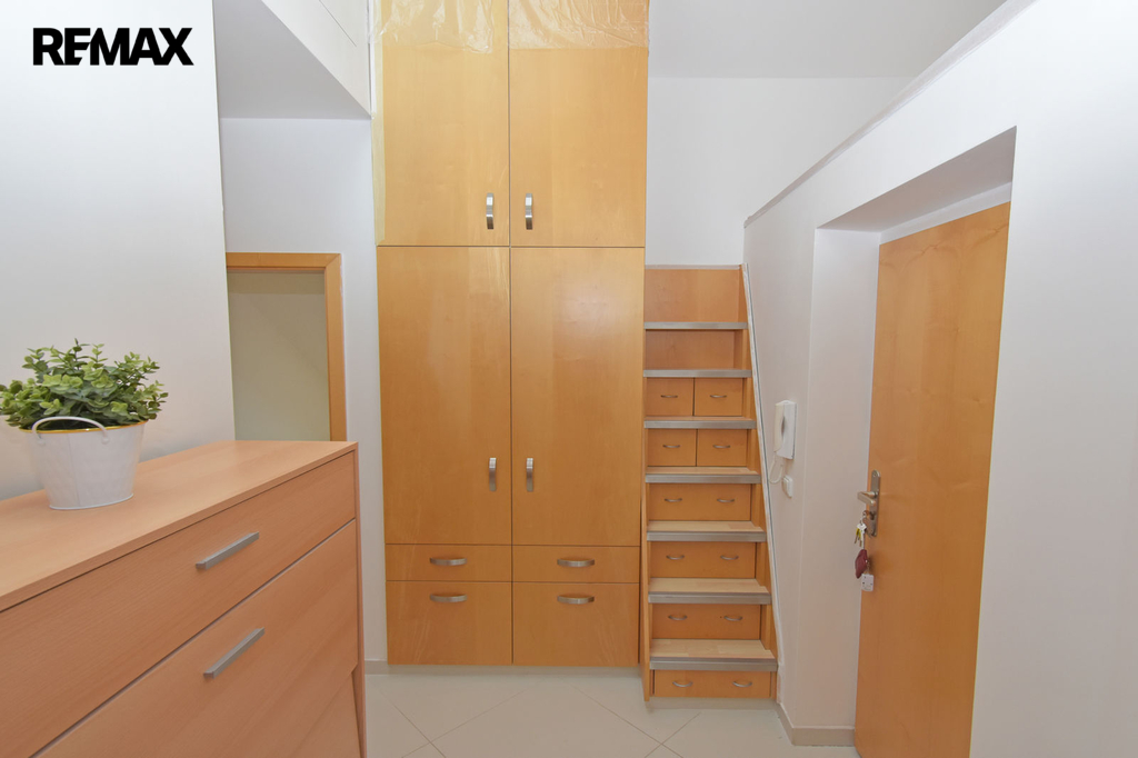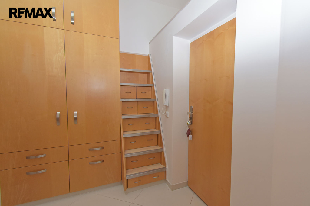 Dispozice bytu zahrnuje zádveří včetně vestavných úložných prostor a schody do vestavného patra. Úložné prostory se nachází i v jednotlivých schodech do vestavného patra. Dominantou bytu je prostorný světlý obývací pokoj s kuchyňským a jídelním koutem, který tvoří srdce celého domova. Moderní kuchyňská linka je vybavena sadou vestavných spotřebičů (sklokeramická varná deska, digestoř, elektrická trouba, mikrovlnná trouba a myčka). Byt disponuje dvěma samostatnými ložnicemi o velikosti 13 m² a 18 m², prostornou koupelnou (s rohovou vanou, umyvadlem se skříňkou, zrcadlem, místem na pračku a úložné prostory) a samostatnou toaletou s umyvadlem a bidetovou baterií. Součástí pronájmu jednotky je kuchyňská linka s vestavnými spotřebiči i veškeré zabudované vybavení – vestavné šatní skříně v celém bytě, manželská postel s úložným prostorem, sluneční a zatemňovací rolety, přípojky na internet a SAT včetně paraboly a připojení na společnou anténu, klimatizace s dálkovým ovládáním a kompletní osvětlovací tělesa. Podlahové krytiny tvoří plovoucí podlahy a dlažba. Součástí pronájmu je také užívání sklepa a 1x parkovací stání přímo u domu. Byt k dispozici ihned.