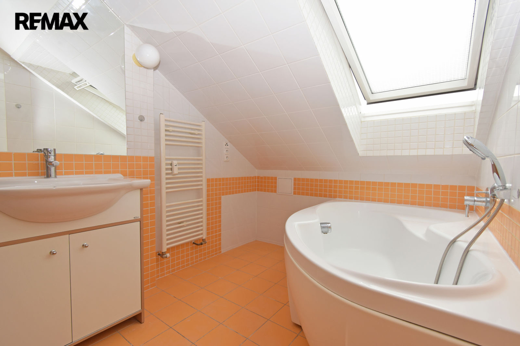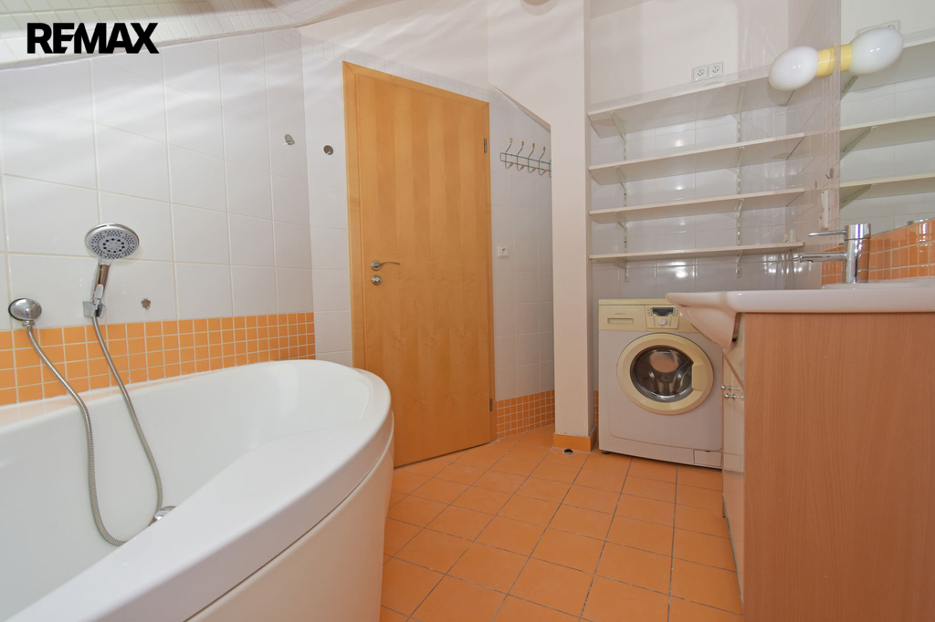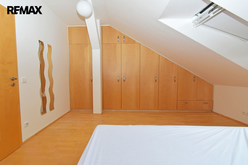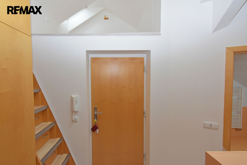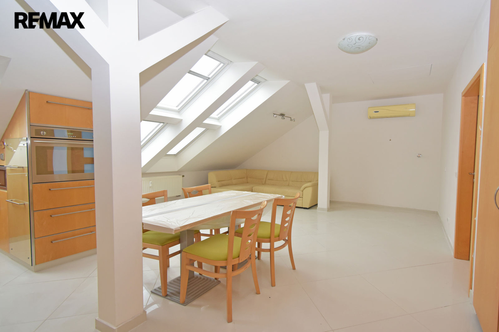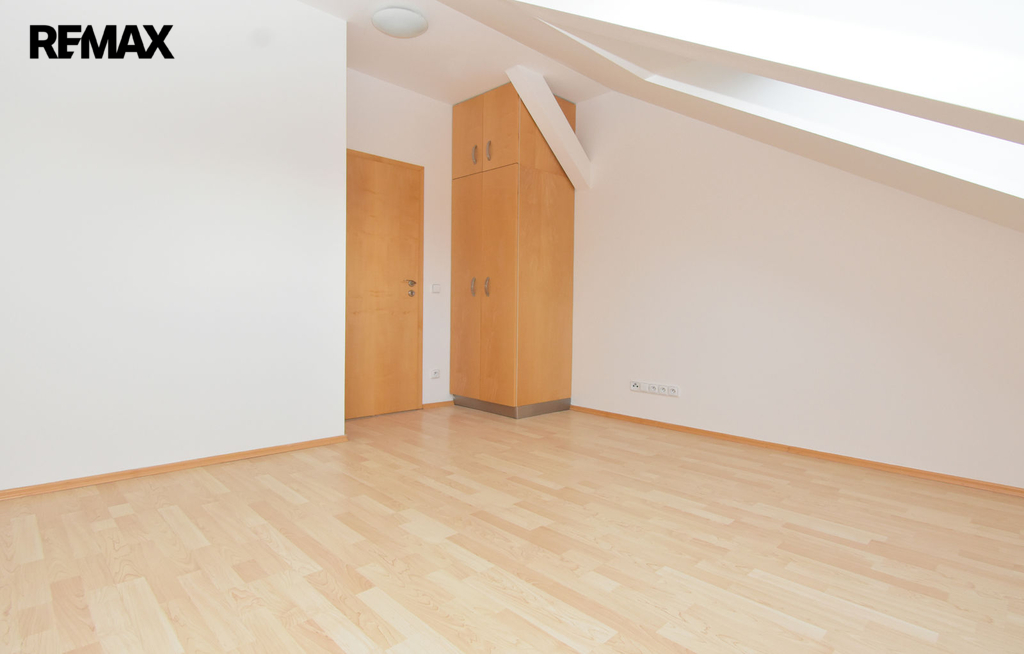 Dispozice bytu zahrnuje zádveří včetně vestavných úložných prostor a schody do vestavného patra. Úložné prostory se nachází i v jednotlivých schodech do vestavného patra. Dominantou bytu je prostorný světlý obývací pokoj s kuchyňským a jídelním koutem, který tvoří srdce celého domova. Moderní kuchyňská linka je vybavena sadou vestavných spotřebičů (sklokeramická varná deska, digestoř, elektrická trouba, mikrovlnná trouba a myčka). Byt disponuje dvěma samostatnými ložnicemi o velikosti 13 m² a 18 m², prostornou koupelnou (s rohovou vanou, umyvadlem se skříňkou, zrcadlem, místem na pračku a úložné prostory) a samostatnou toaletou s umyvadlem a bidetovou baterií. Součástí pronájmu jednotky je kuchyňská linka s vestavnými spotřebiči i veškeré zabudované vybavení – vestavné šatní skříně v celém bytě, manželská postel s úložným prostorem, sluneční a zatemňovací rolety, přípojky na internet a SAT včetně paraboly a připojení na společnou anténu, klimatizace s dálkovým ovládáním a kompletní osvětlovací tělesa. Podlahové krytiny tvoří plovoucí podlahy a dlažba. Součástí pronájmu je také užívání sklepa a 1x parkovací stání přímo u domu. Byt k dispozici ihned.