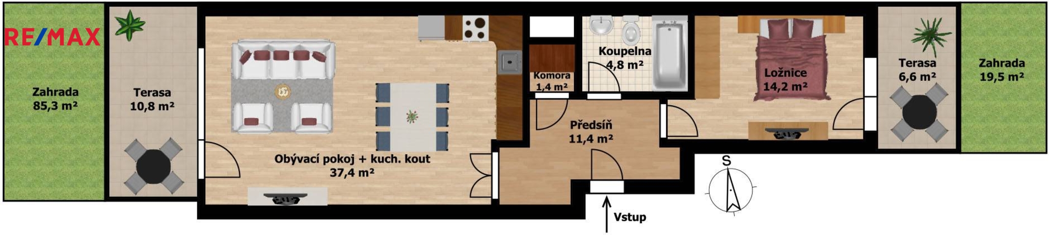 Orientace bytu: obývací místnost s terasou a zahradou na západ, ložnice s terasou a zahradou na východ.