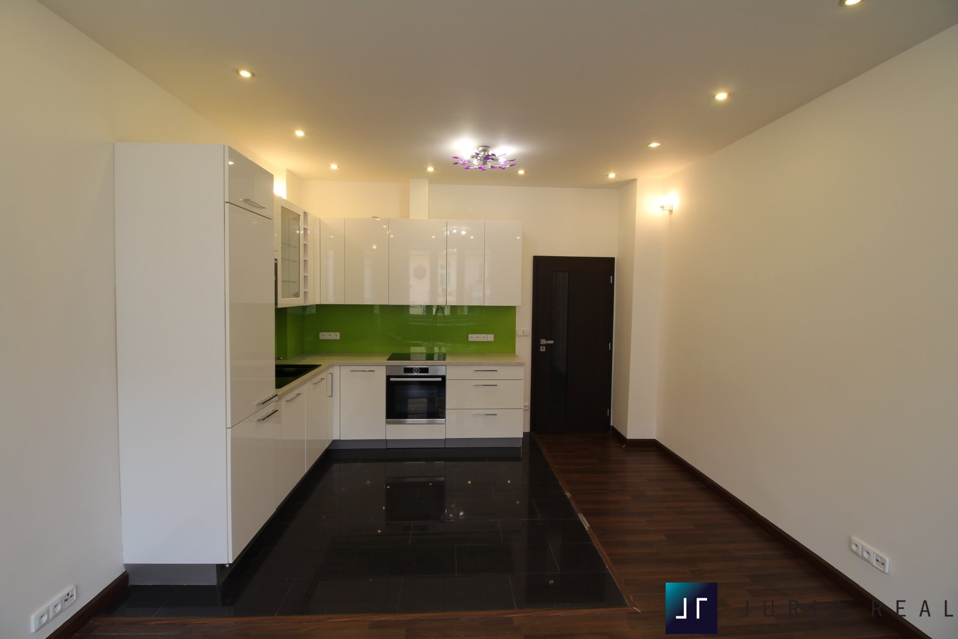 Dominantou bytu je světlý obývací prostor s moderní kuchyňskou linkou ve vysokém lesku, vybavenou vestavnými spotřebiči Bosch. Interiér působí velmi vzdušně díky jednotným dřevěným podlahám a promyšlenému dispozičnímu řešení. Prostor nabízí dostatek místa pro velkou sedací soupravu i jídelní část.