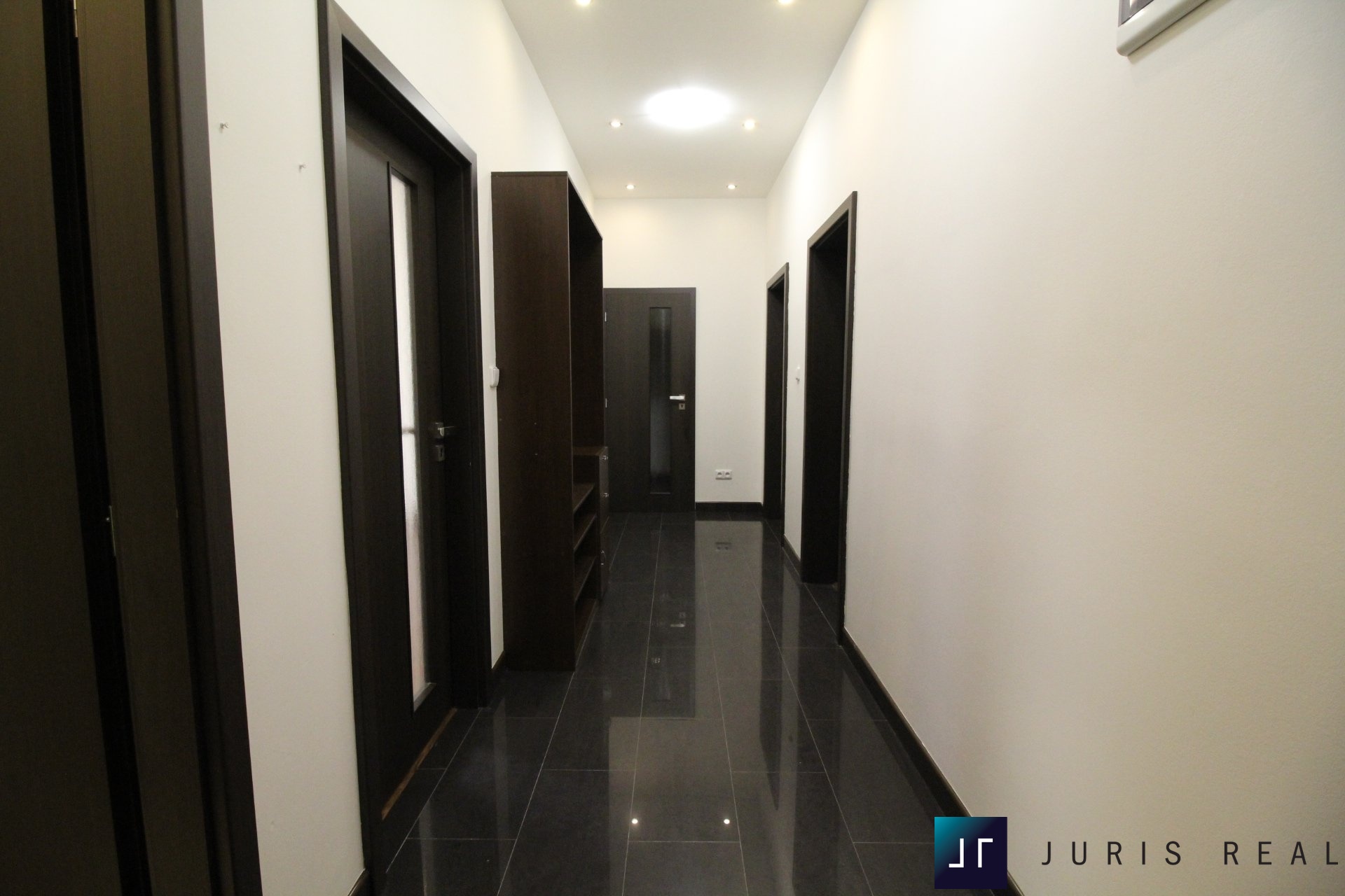 Dispozice bytu zahrnuje velký obývací pokoj s kuchyňským koutem, dva samostatné neprůchozí pokoje, koupelnu s vanou, samostatné WC, šatnu, pracovnou a prostornou vstupní halu. Byt nabízí dostatek úložných prostor i soukromí pro rodinné bydlení.