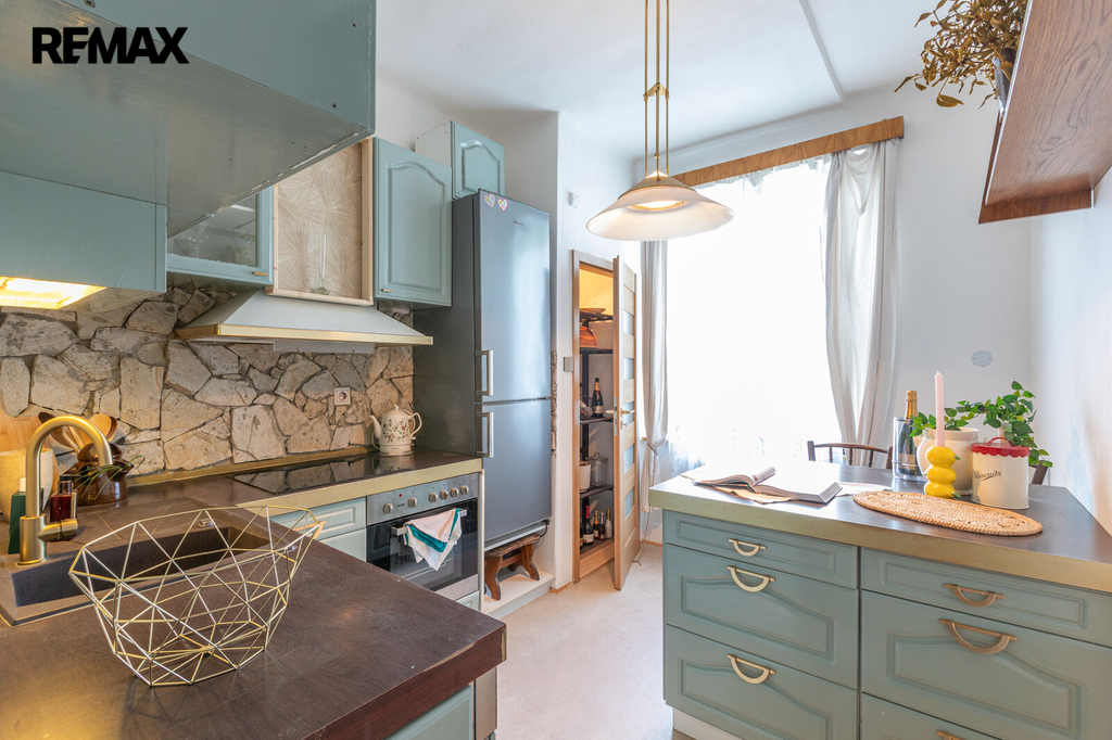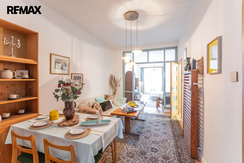 Byt působí vzdušně díky vyšším stropům a obsahuje vstupní předsíň, dvě místnosti orientované do velice klidného dvora, jídelnu a na ní navazující obývací pokoj s hezkým výhledem na západní stranu. Dále je zde koupelna s vanou, samostatné WC s integrovaným umyvadlem, komora/šatna a praktická spíž.