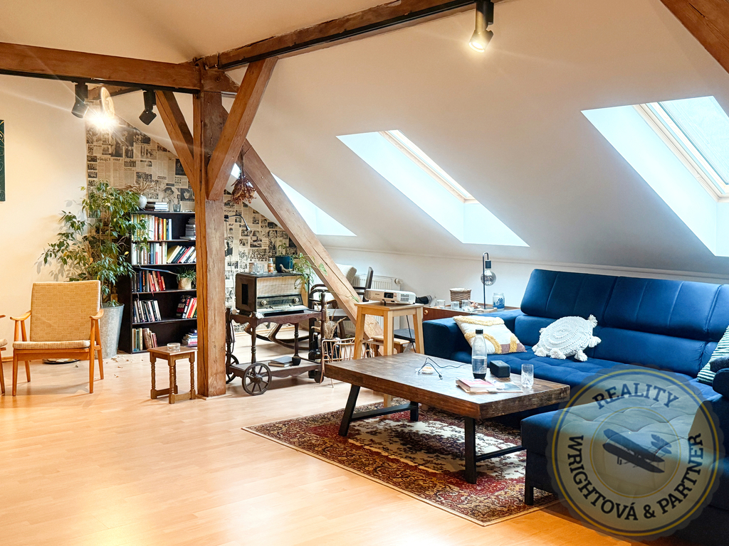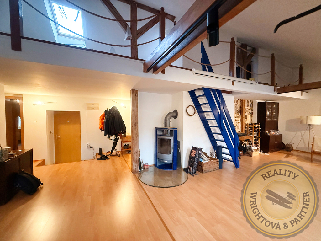 Prodej prostorného bytu s duší: podkrovní mezonet s galerií a krbem – Praha 5