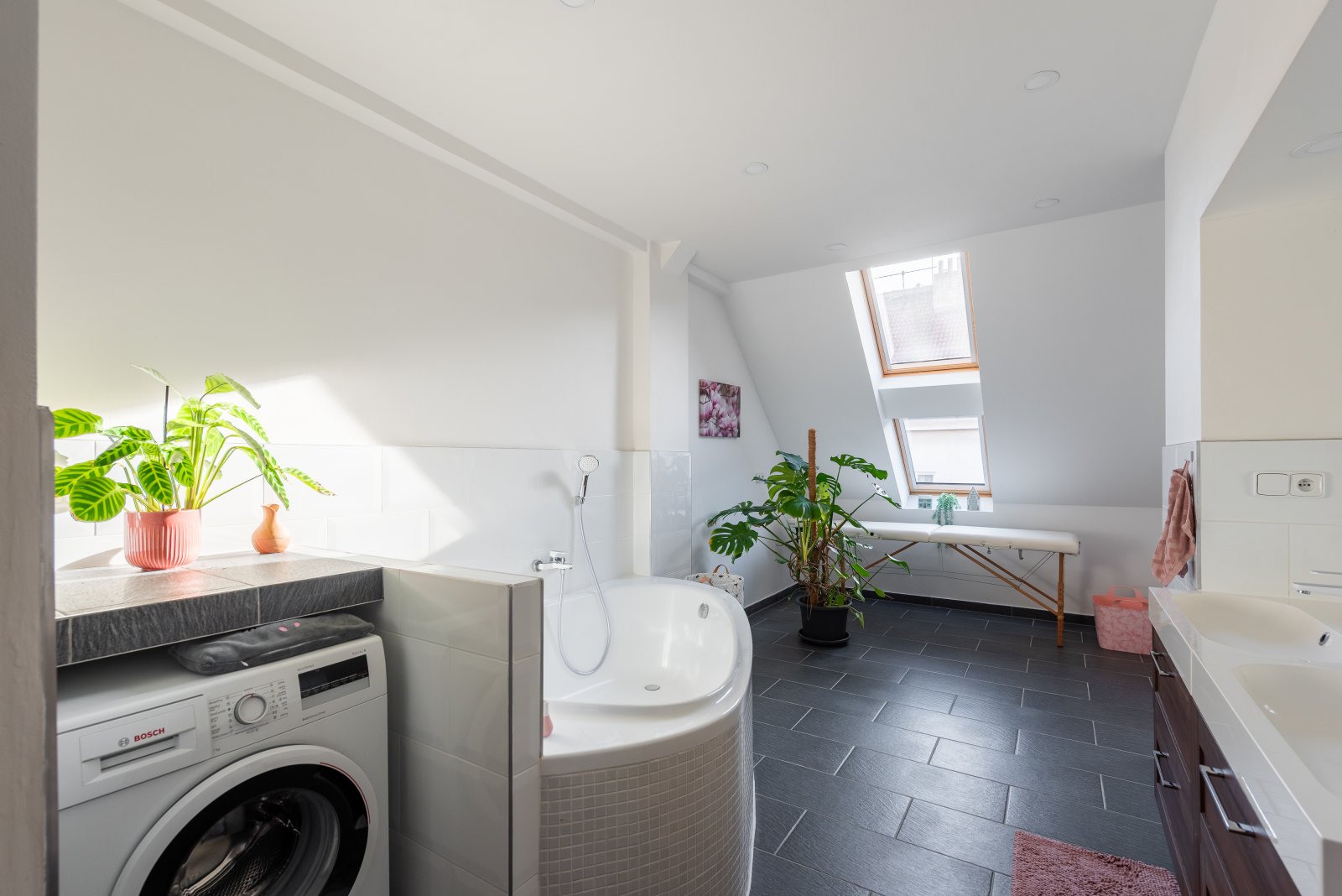 Na spodní úrovni se nachází velká vstupní hala, hlavní ložnice (22 m²) a opravdu výjimečná koupelna (21m2) s vanou pro dva, prostorným sprchovým koutem, dvojitým umyvadlem a vlastní infrasaunou. Příjemný dojem umocňují velká střešní okna, která poskytují dostatek denního světla. Na tomto podlaží je také velká vestavná skříň ve vstupní chodbě (23m2) a samostatná toaleta s plynovým kotlem.