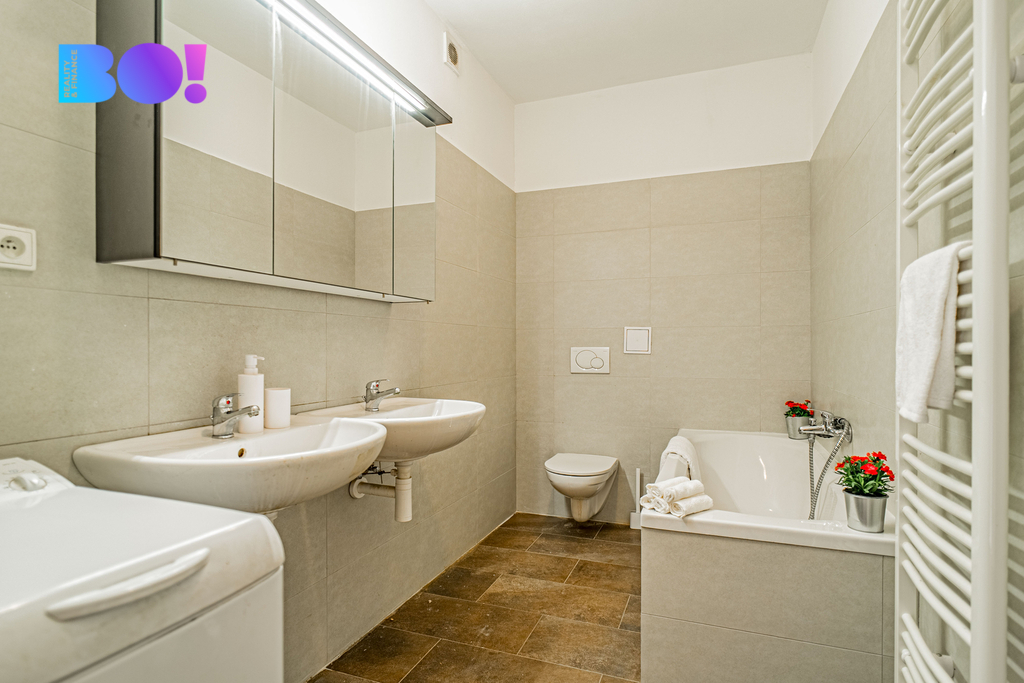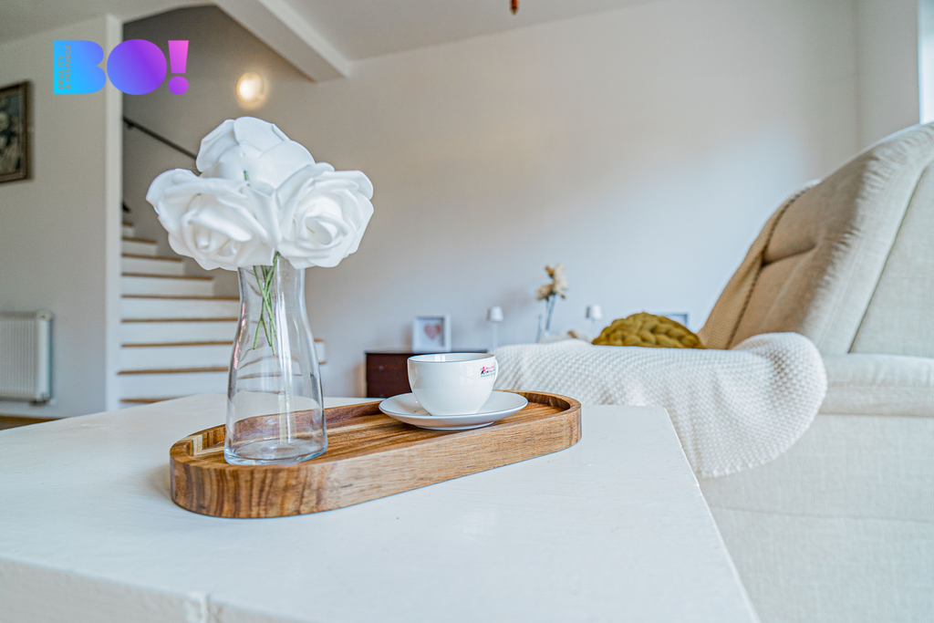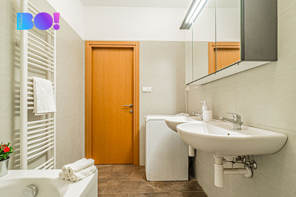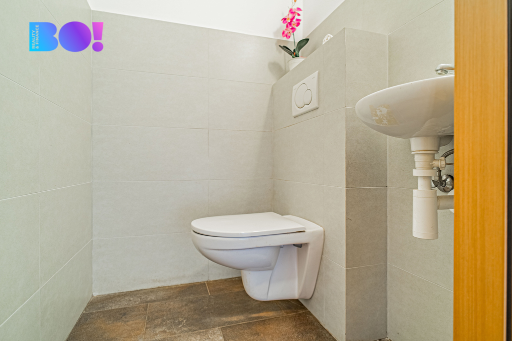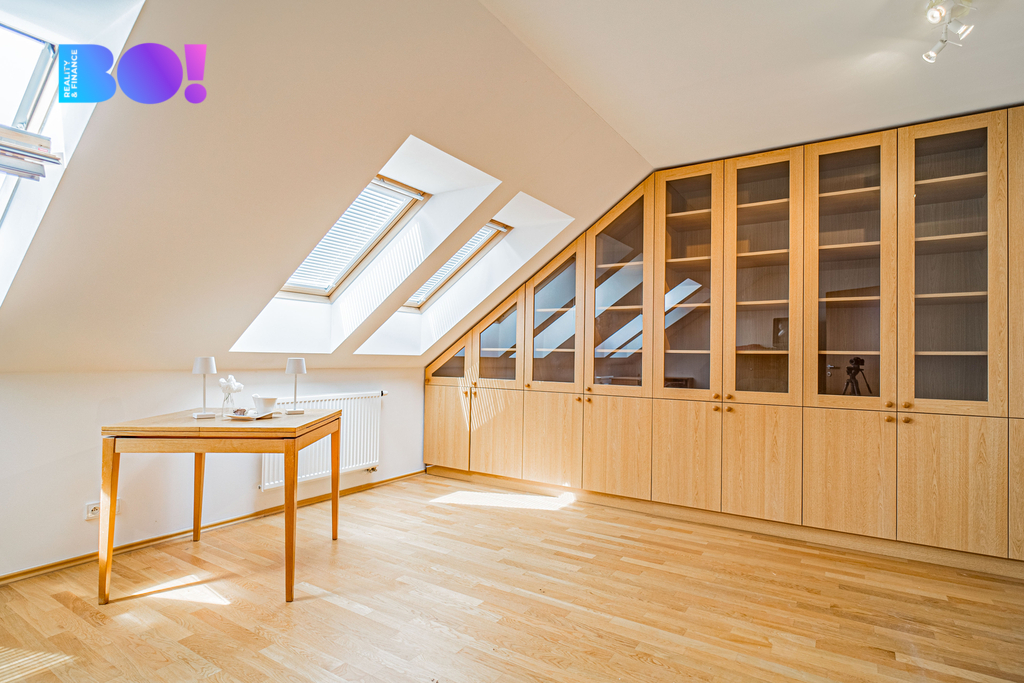 Propojení kuchyně s obývacím pokojem nabízí 55 m² otevřeného prostoru s velkým množstvím denního světla – vysoké stropy a velká okna vytváří vzdušný dojem, který nebývá v řadových domech obvyklý. V domě jsou dvě koupelny a každé patro má min. 1 WC, což je komfortní i pro větší rodinu nebo zástupce více generací. Všechna okna jsou opatřena žaluziemi. V celém domě naleznete kvalitní dřevěné masivní podlahy, dveře a zárubně i dřevěná střešní okna Velux a nadčasový design.