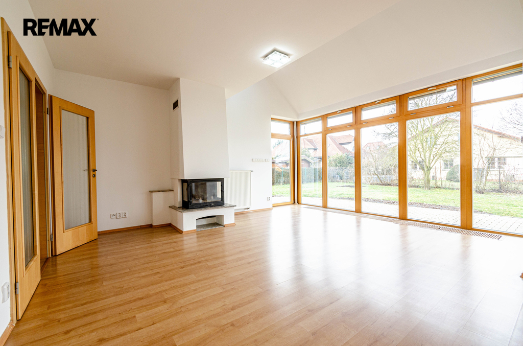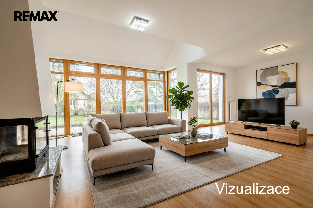 Obývací pokoj s krbem je velmi prostorný a orientovaný do zahrady.