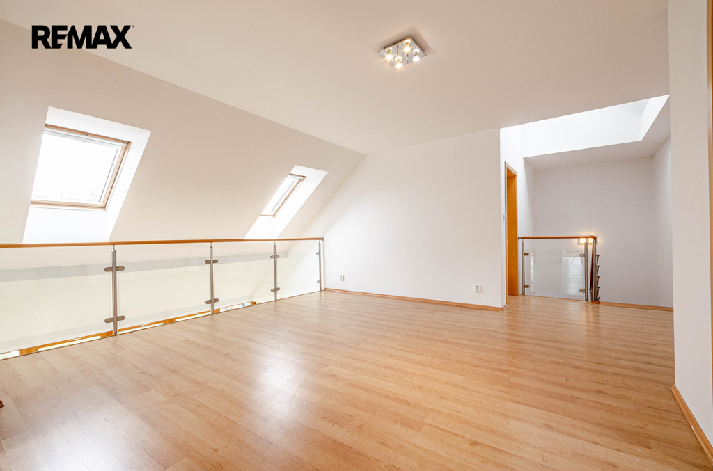 V patře jsou 3 samostatné ložnice, dvě koupelny, galerie a schodiště.
