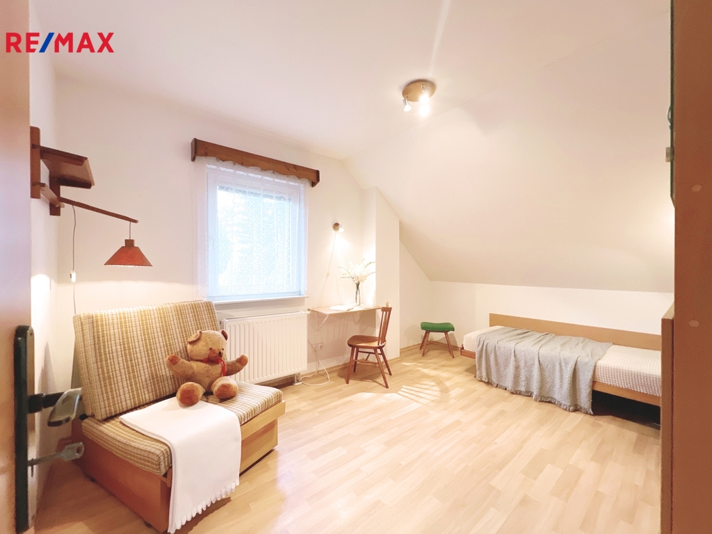V patře jsou tři samostatné ložnice, šatna a druhá koupelna kompletně vybavená a i s místem pro pračku a sušičku. Dále velký půdní úložný prostor.