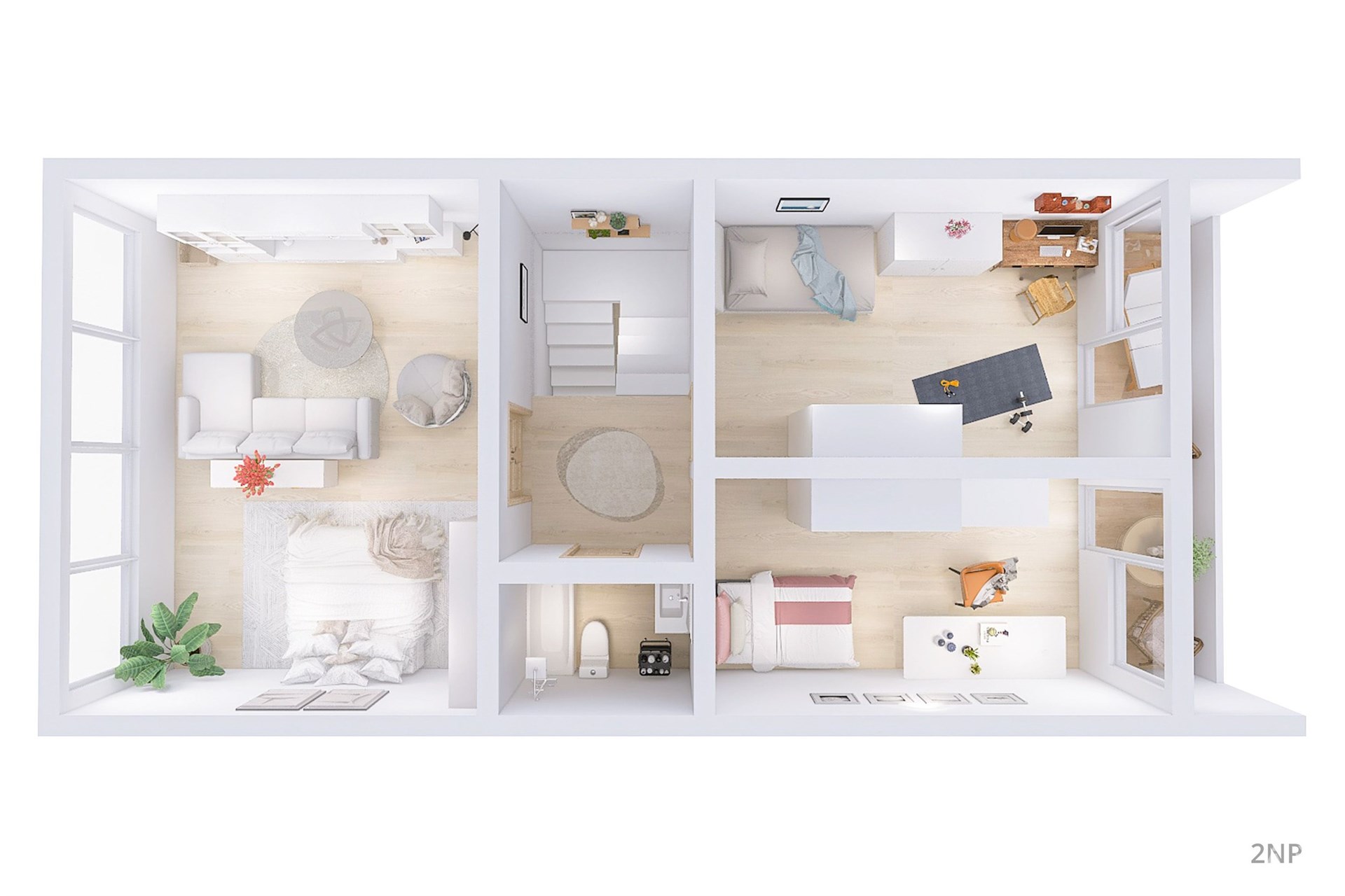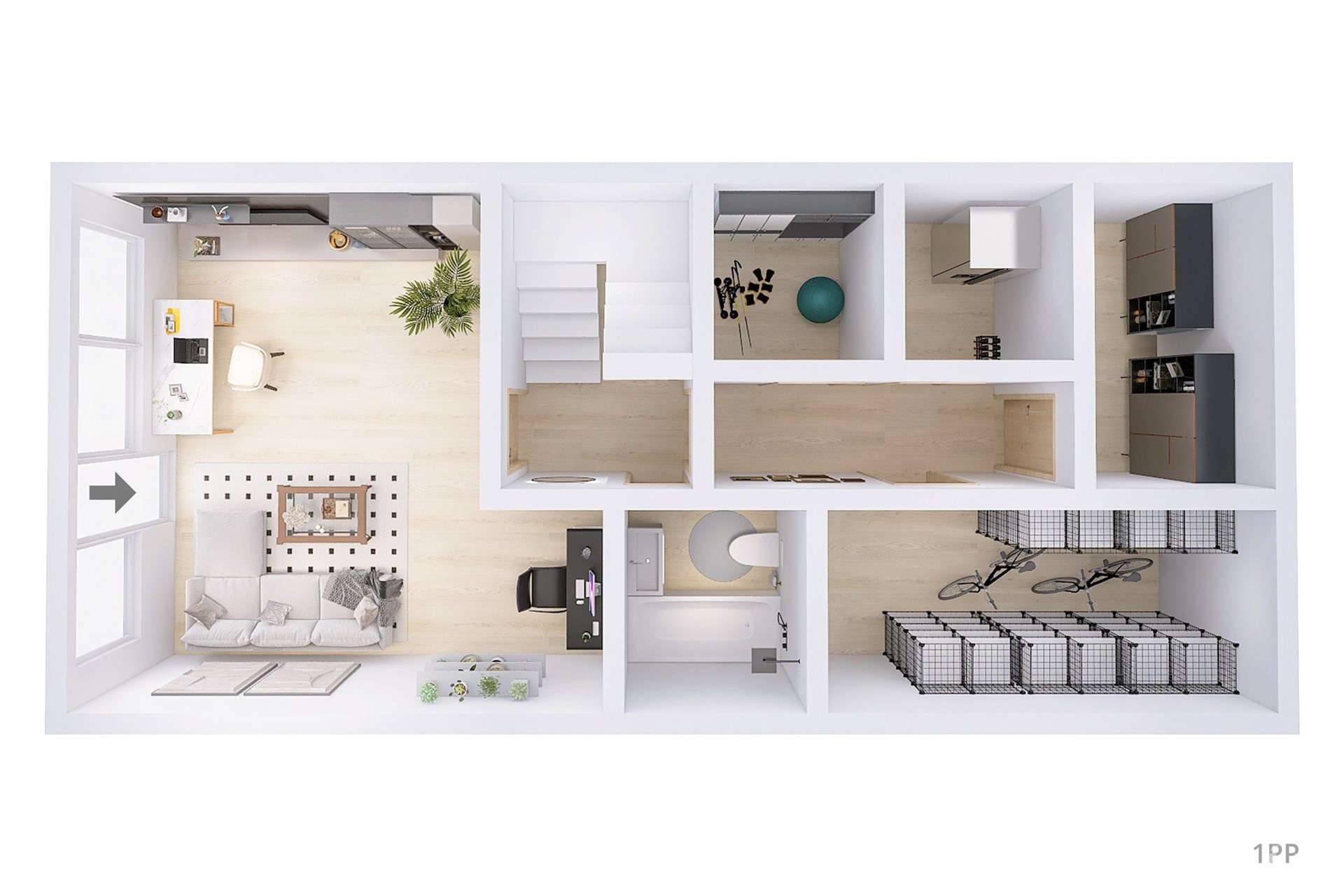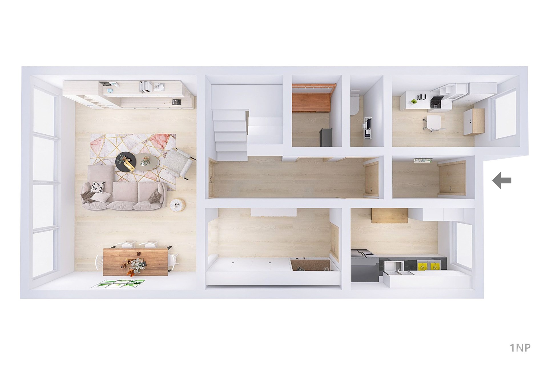 V přízemí domu se nachází skladové a technické místnosti, toaleta a obývací pokoj se vstupem na zahradu. V prvním podlaží domu se nachází šatní místnost, toaleta komora, kuchyň a obývací pokoj. Ve druhém podlaží domu se nachází 2 ložnice se vstupem na balkon, hlavní ložnice s výhledem do zahrady a toaleta.