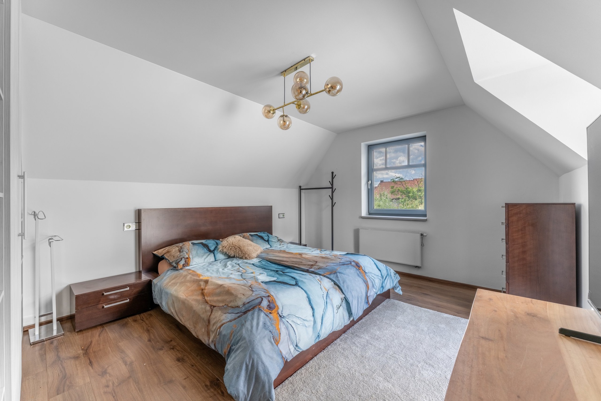 V horním patře se nachází dvě ložnice 17,5 a 9,7 m2 s vestavěnými šatními skříněmi. Větší z ložnic je klimatizovaná. Koupelna se sprchovým koutem a WC má výměru 4,1 m2. Na chodbě najdeme také vestavěnou skříň, další úložné prostory se nacházejí na půdě.