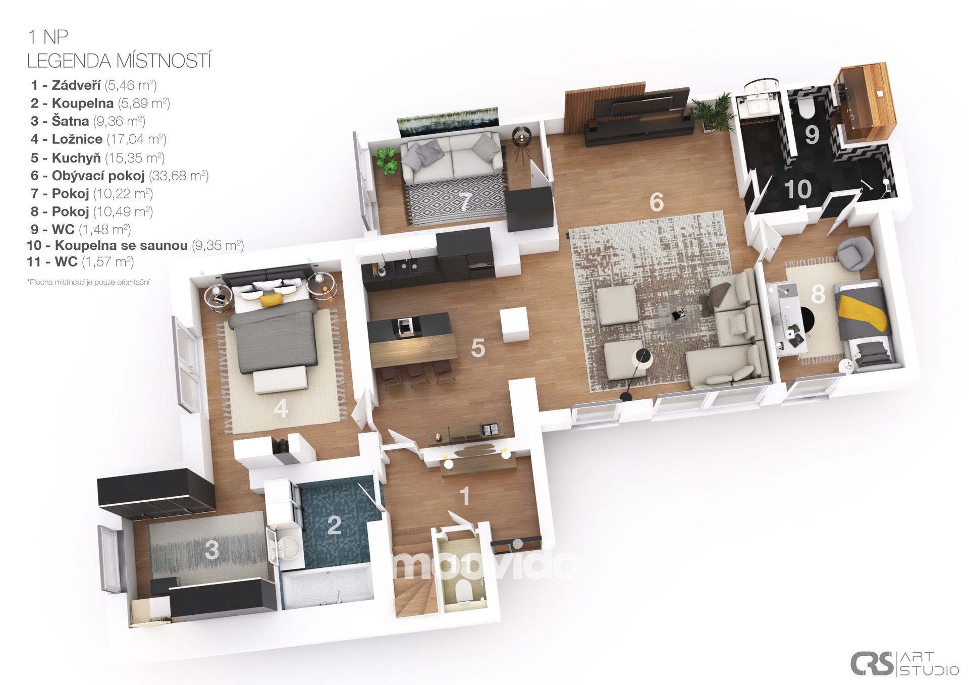 V přízemí domu o výměře 118 m2 se nachází prostorný obývací pokoj (33 m2) se vstupem na terasu s kuchyňským koutem (15,35 m2), pokojem (17 m2) se vstupem na terasu, na který navazuje pracovna (9,39 m2), dvě ložnice (10,22 a 10,49 m2) - jedna s vlastní koupelnou a infrasaunou (9,35 m2). Dále je zde samostatná koupelna s vanou (5,89 m2) a toaleta (1,48 m2).