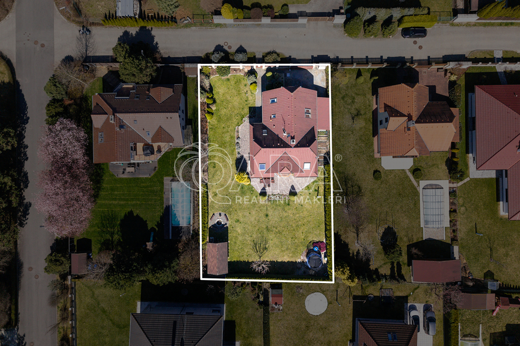 Dům z roku 2004 je dispozičně řešen jako 6+1 s garáží a je ve velmi dobrém stavu. Přízemí využíváno jako společenská zóna: obývací pokoj s krbem a navazující terasou, samostatná kuchyně s komorou, pracovna, hala se schodištěm, koupelna se sprchovým koutem a samostatné WC. V patře se nachází čistě soukromá část, kterou tvoří 4x ložnice (tři ložnice mají vstup na balkon), hlavní koupelna s vanou, sprchovým koutem a s WC, chodba a menší koupelna se sprchovým koutem a s WC. Posledním prostorem v domě je půda (úložný prostor pro lyže, kufry, sportovní vybavení a sezonní potřeby pro celou rodinu).