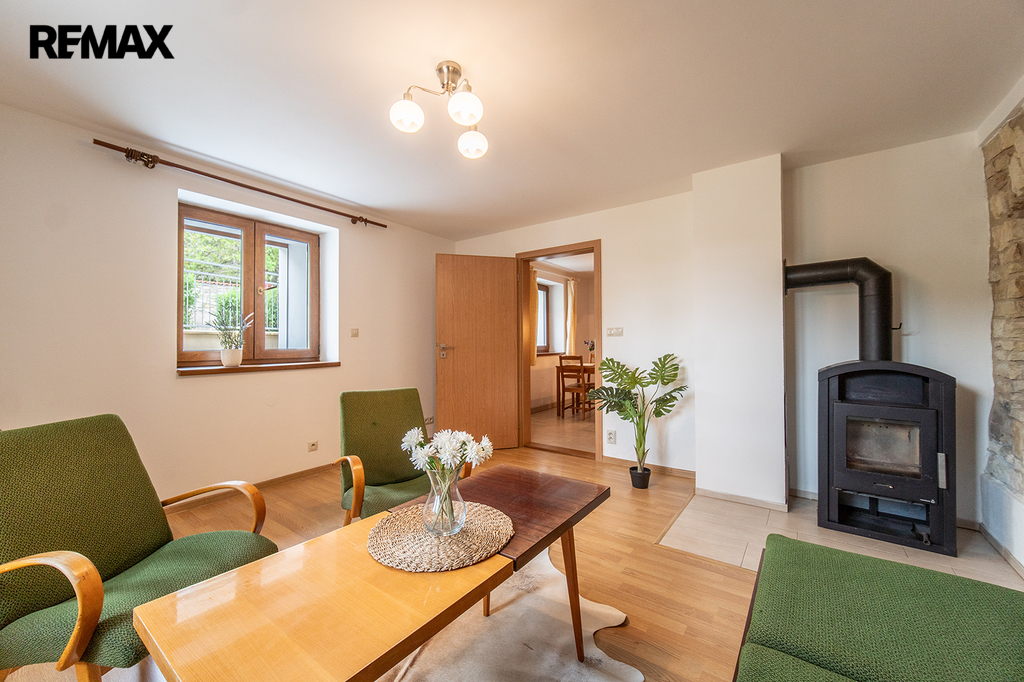 Byt je vytápěn podlahovým topením. K dispozici jsou i krbová kamna.