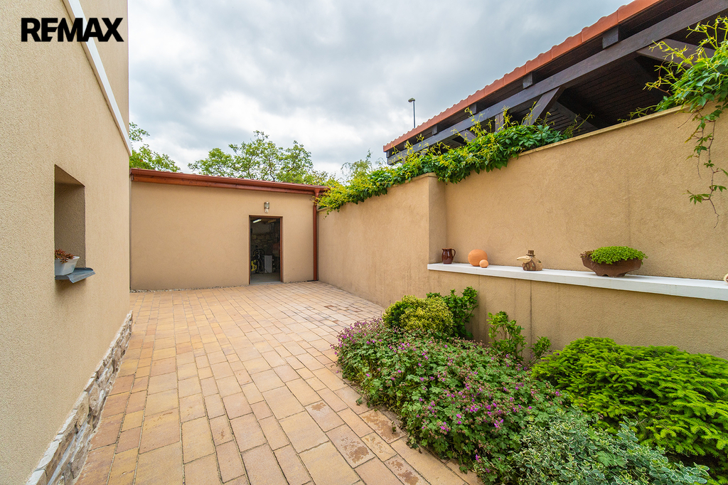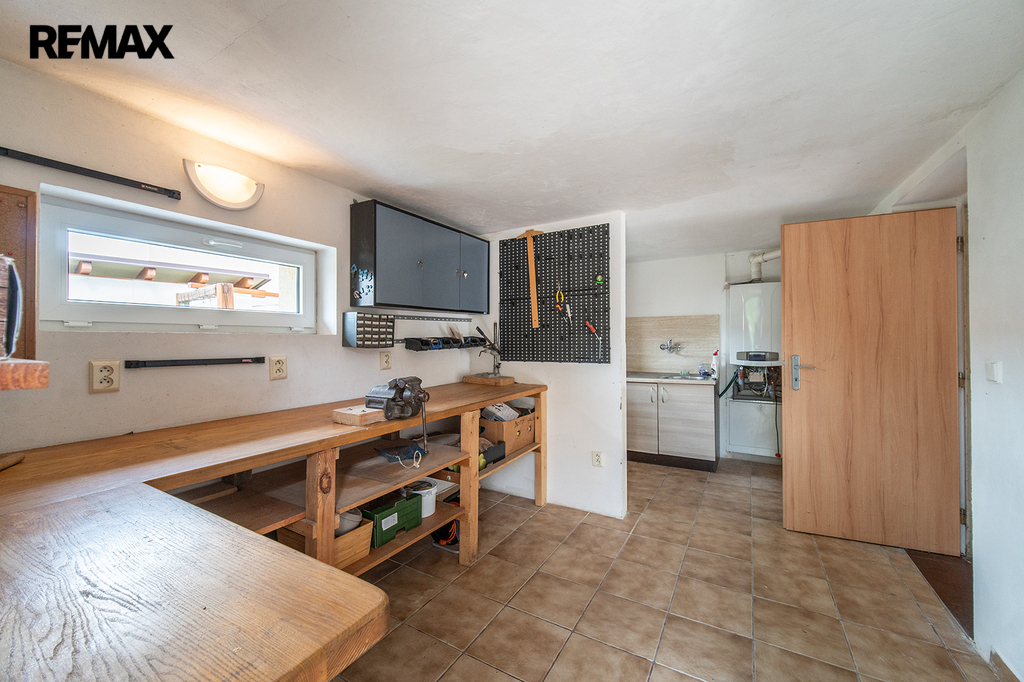 Technická místnost (14,79 m2) s toaletou přístupná z garáže a zahrady - lze využít i jako letní kuchyň.