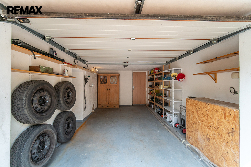 Garáž pro 1 vůz (16,06 m2) - zásuvka na 400 V. Garážová vrata i vjezdová brána je na dálkové ovládání.