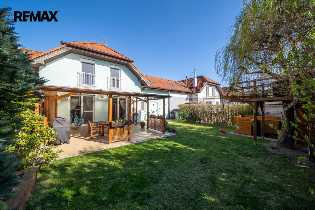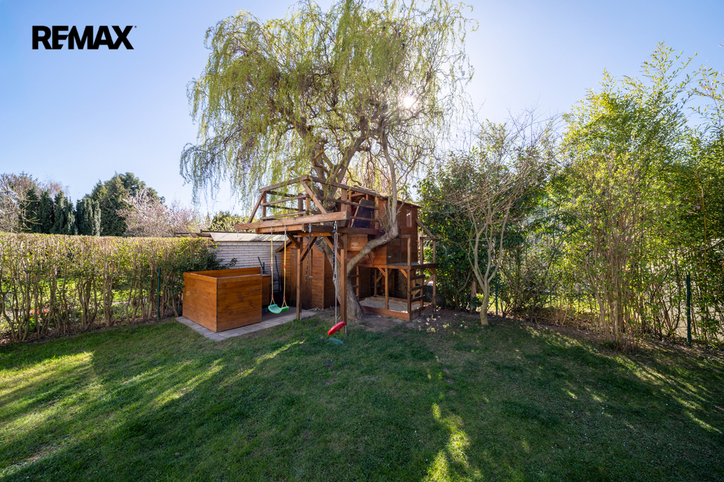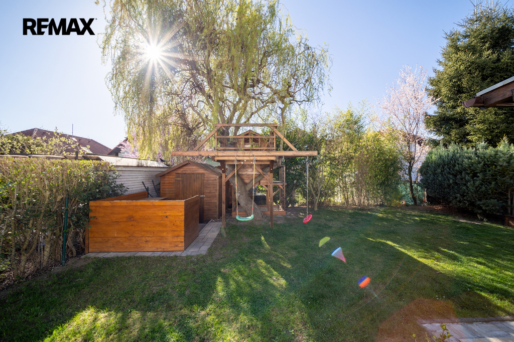 Za domem se nachází udržovaná zahrada se zahradním domkem a s dětskými herními prvky včetně domu ve stromě, citlivě zakomponovaného do vzrostlého stromu.