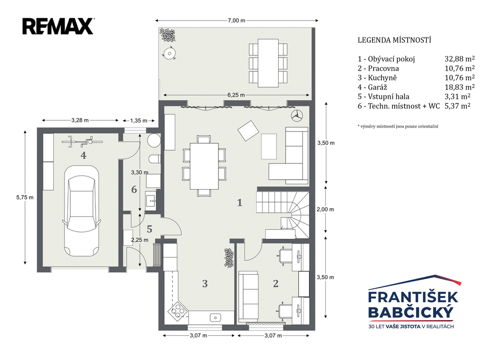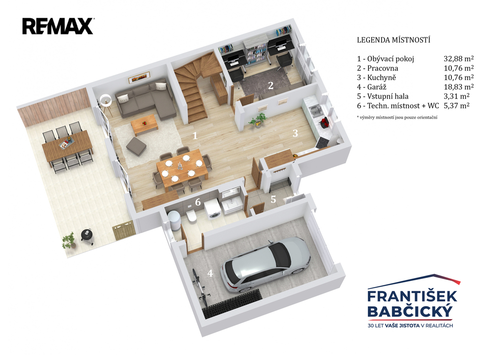 Dispozice domu zahrnuje v 1. NP prostorný obývací pokoj 32,88 m² se dvěma vstupy na zastřešenou terasu a do zahrady, dále navazující kuchyň 10,76 m², samostatnou pracovnu 10,76 m², koupelnu se sprchovým koutem a toaletou s přímým vstupem do garáže 5,37 m², vstupní předsíň 3,31 m² a garáž 18,83 m² s výstupem do zahrady, přičemž před domem je k dispozici kryté stání pro dvě auta. Jednotlivá podlaží jsou propojena schodištěm situovaným v centrální části domu. Ve 2. NP se nachází prostorná ložnice 27,88 m² doplněná o další 3 pokoje o velikostech 14,53 m², 11,20 m² a 11,20 m², dále koupelna 8,21 m² s vanou, sprchovým koutem a toaletou, komora 1,78 m² a chodba se schodištěm 10,45 m². Součástí domu je také praktická pochozí půda s oknem, která nabízí další úložný prostor.