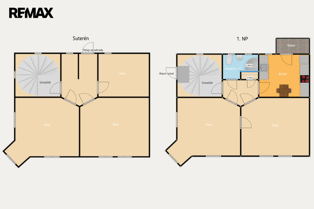 Suterén má samostatný vchod také ze zahrady. Je zde předsíň a 3 sklepní místnosti (původně sklep, prádelna a sklad potravin).