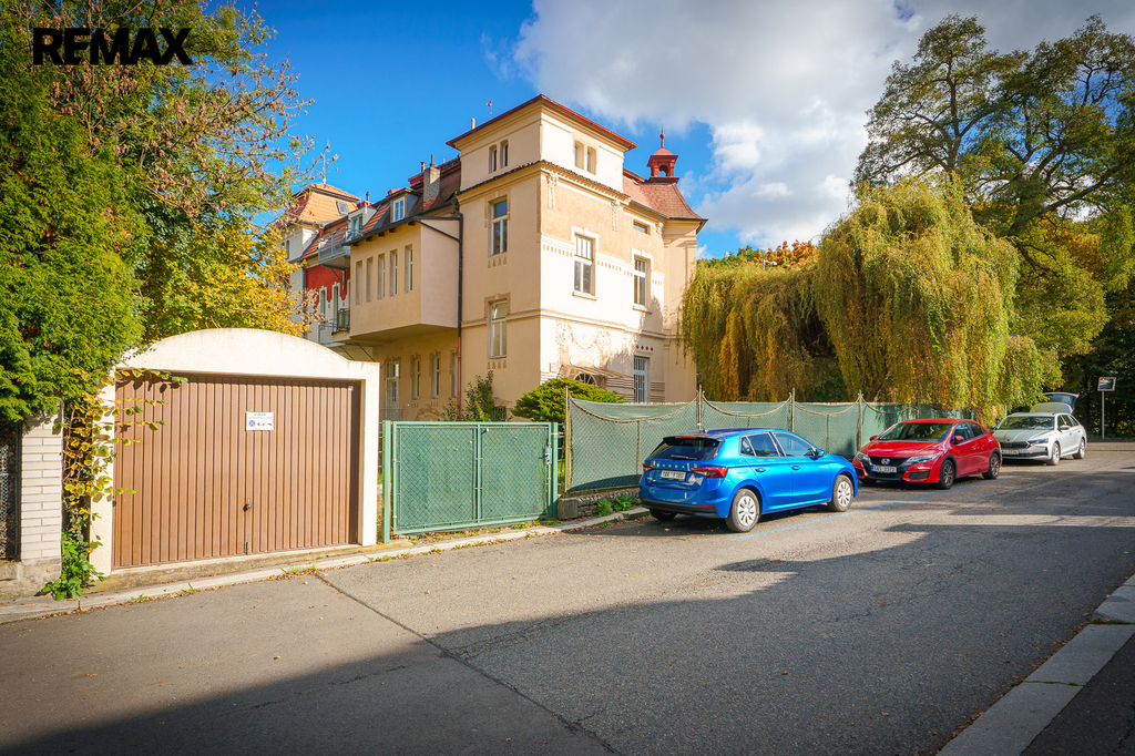 Z boční ulice se vjíždí do samostatné garáže nebo na parkovací místo přímo na pozemku.