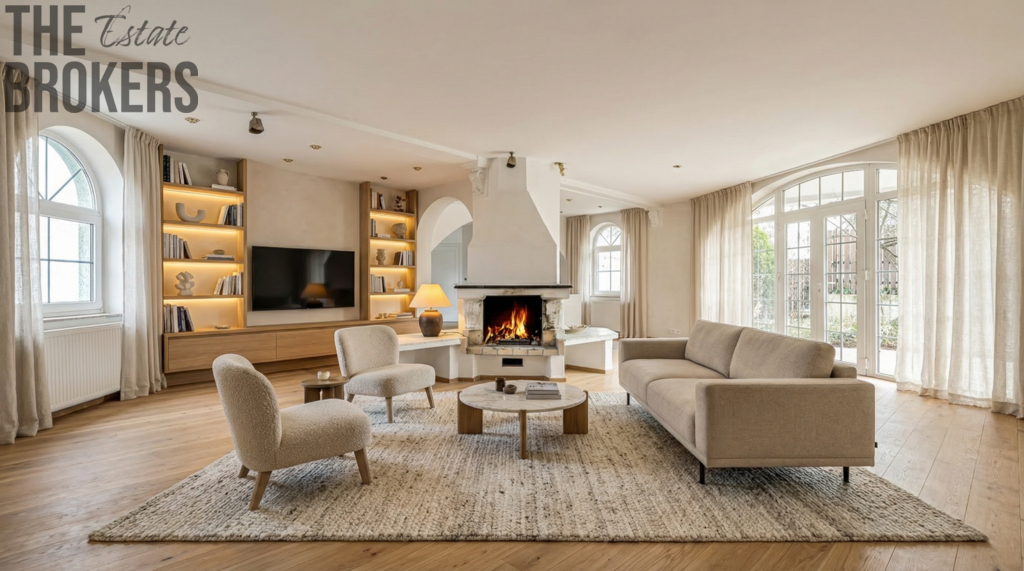 Interiér vyniká vysokými stropy, obloukovými průchody a velkými okny, které zajišťují dostatek přirozeného světla po celý den. Terasy a balkon přirozeně propojují obytné prostory se zelení v okolí a podtrhují rezidenční charakter domu.