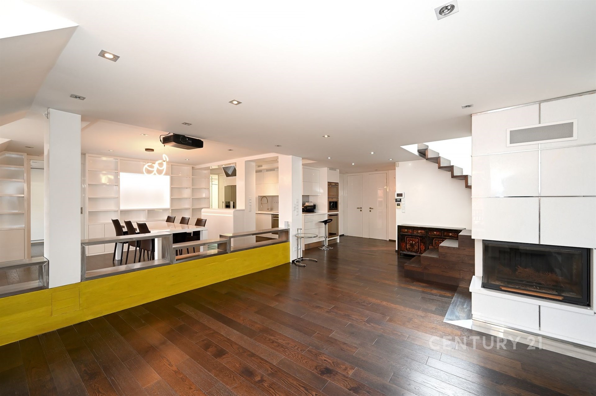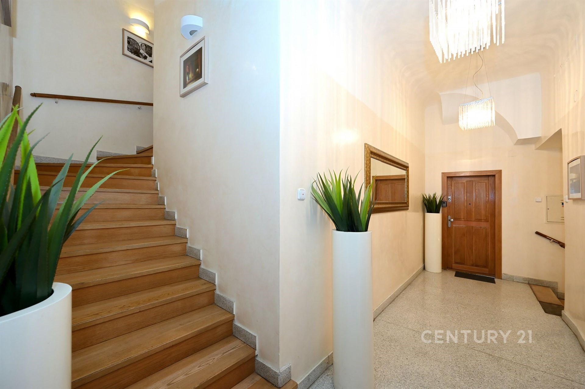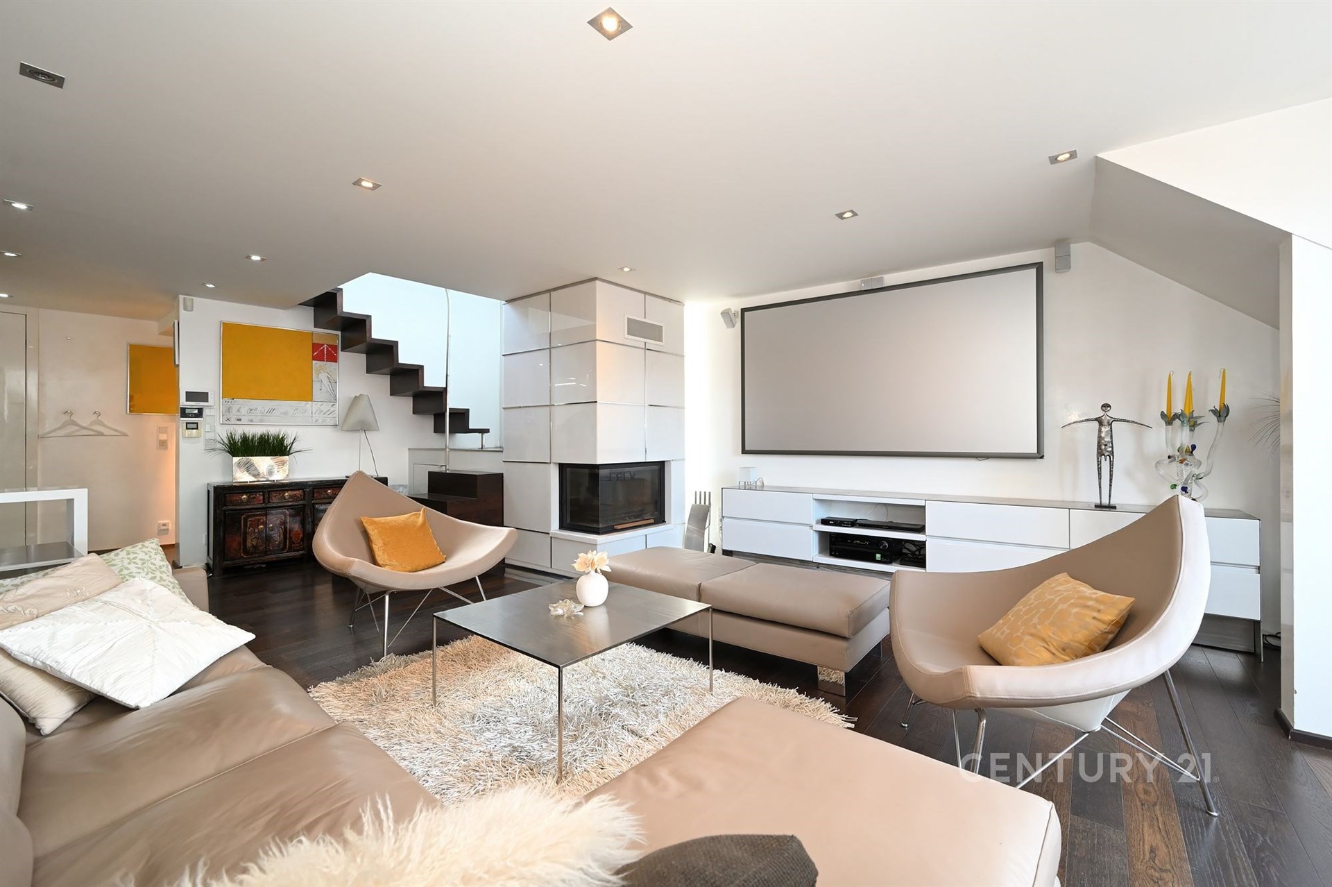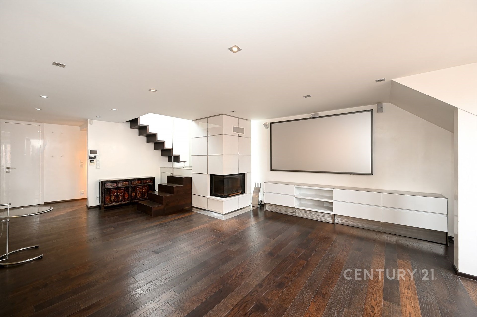 Široké schodiště s oknem a zabudovanými skříňkami na boty vede do hlavního a největšího prostoru bytu otevřené obývací haly s kuchyňským koutem. Technická místnost s oknem je vybavena pračkou, plynovým kotlem Vailant a skladovacími prostory. Vedle ní je samostatné WC s oknem pro hosty a velká koupelna se dvěma okny, masážní vanou, sprchovacím koutem, umyvadlem a WC se zabudovaným bidetem. Koupelna je vybavena reproduktory z dalšího audio systému a menší televizí na zdi.