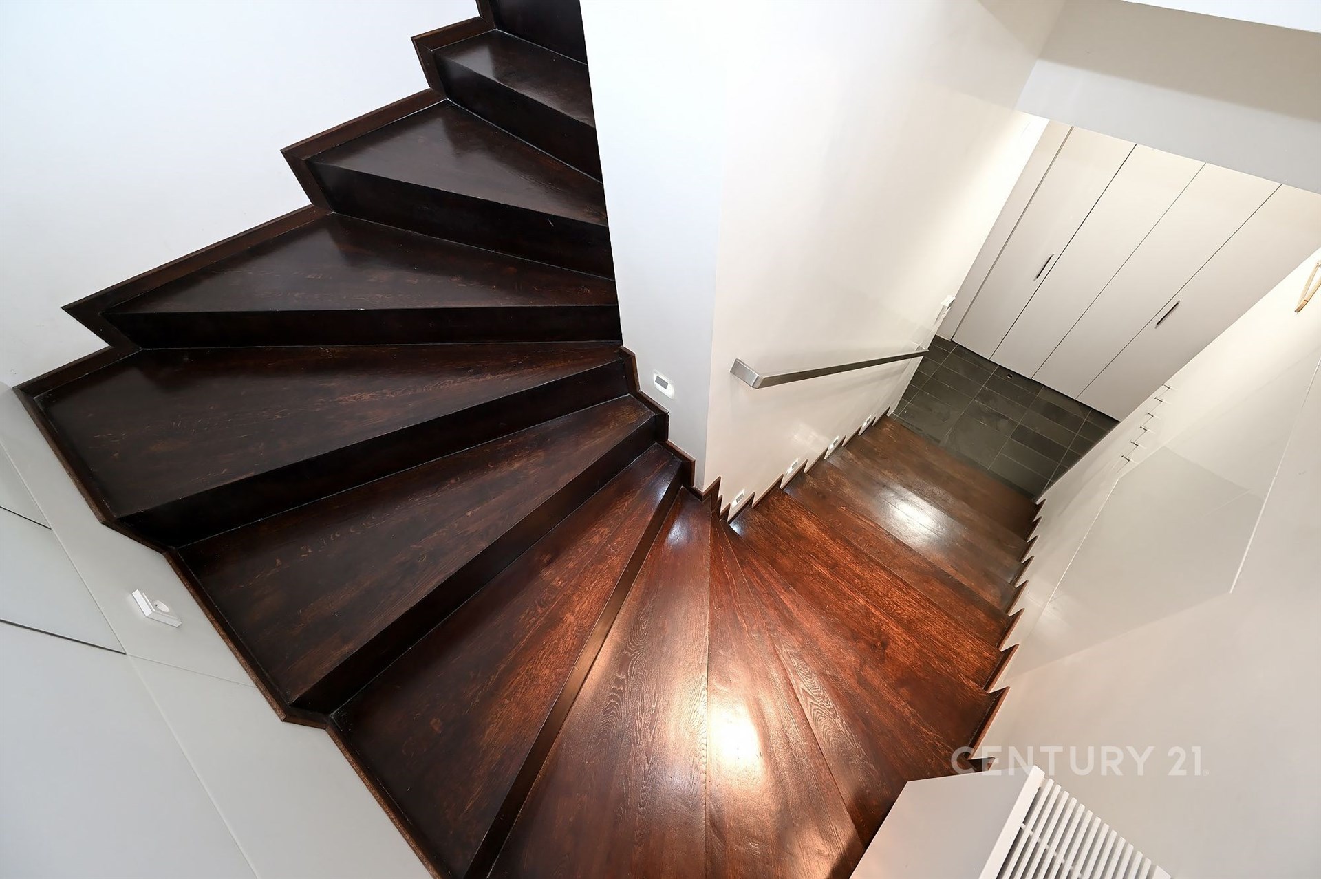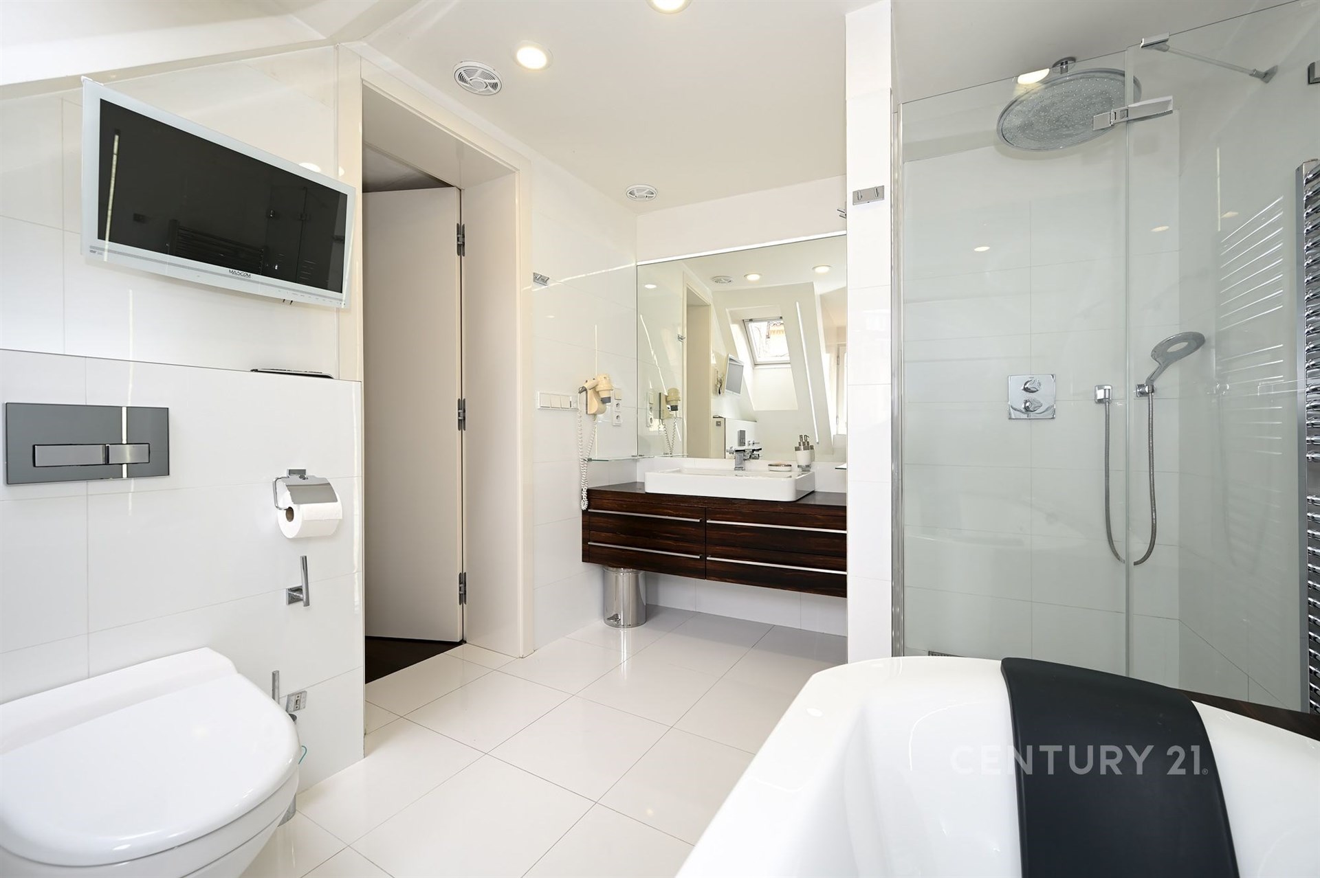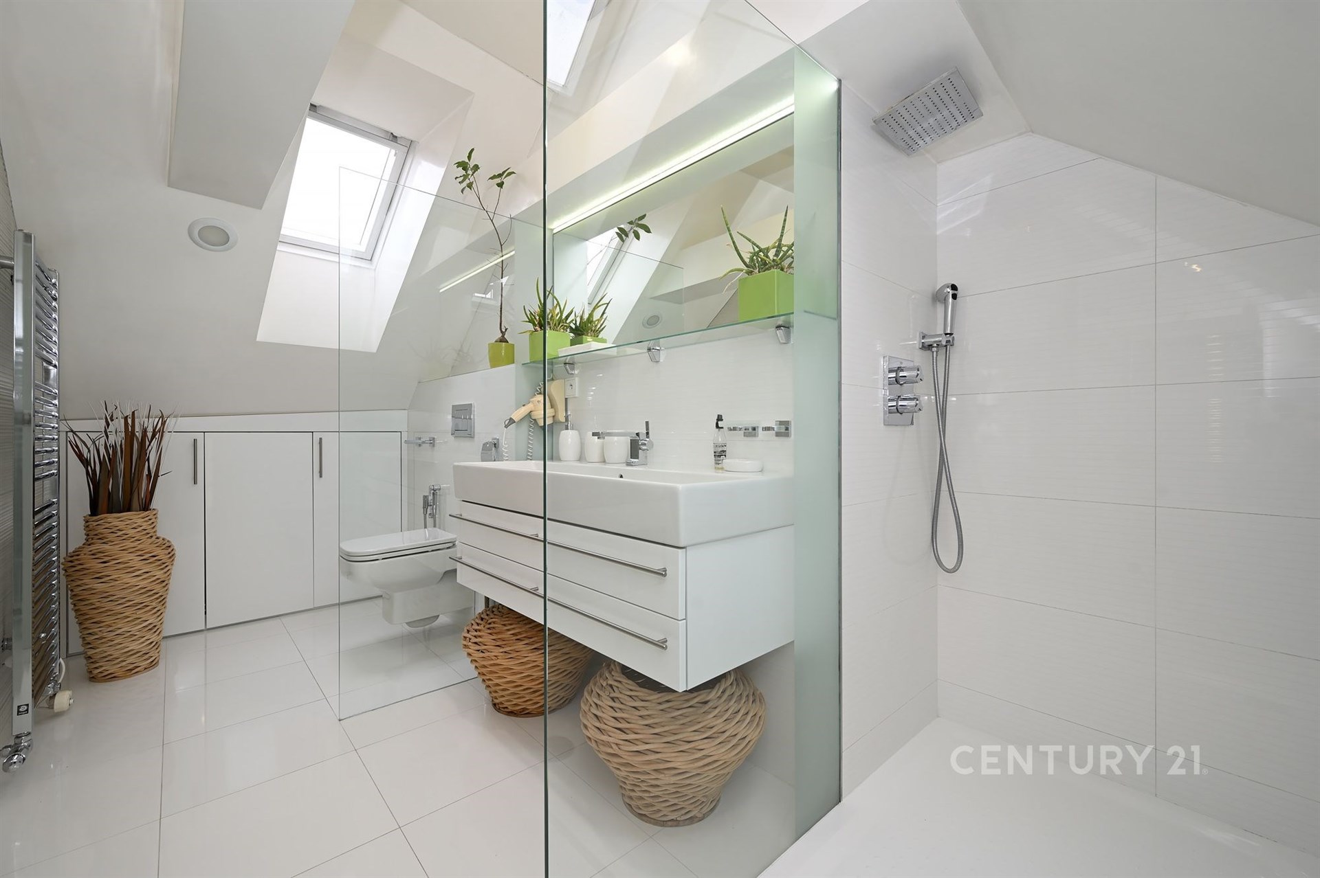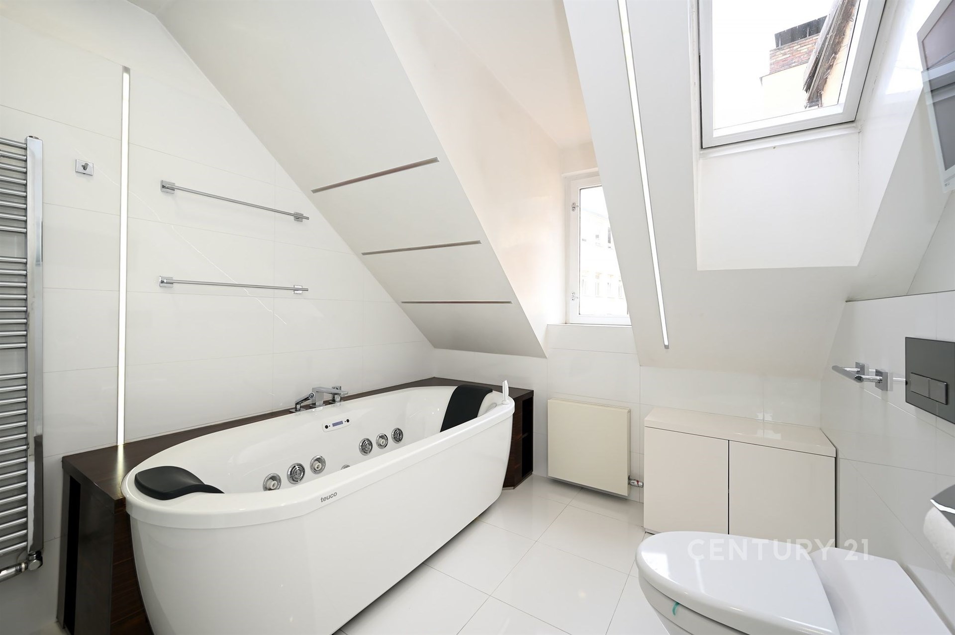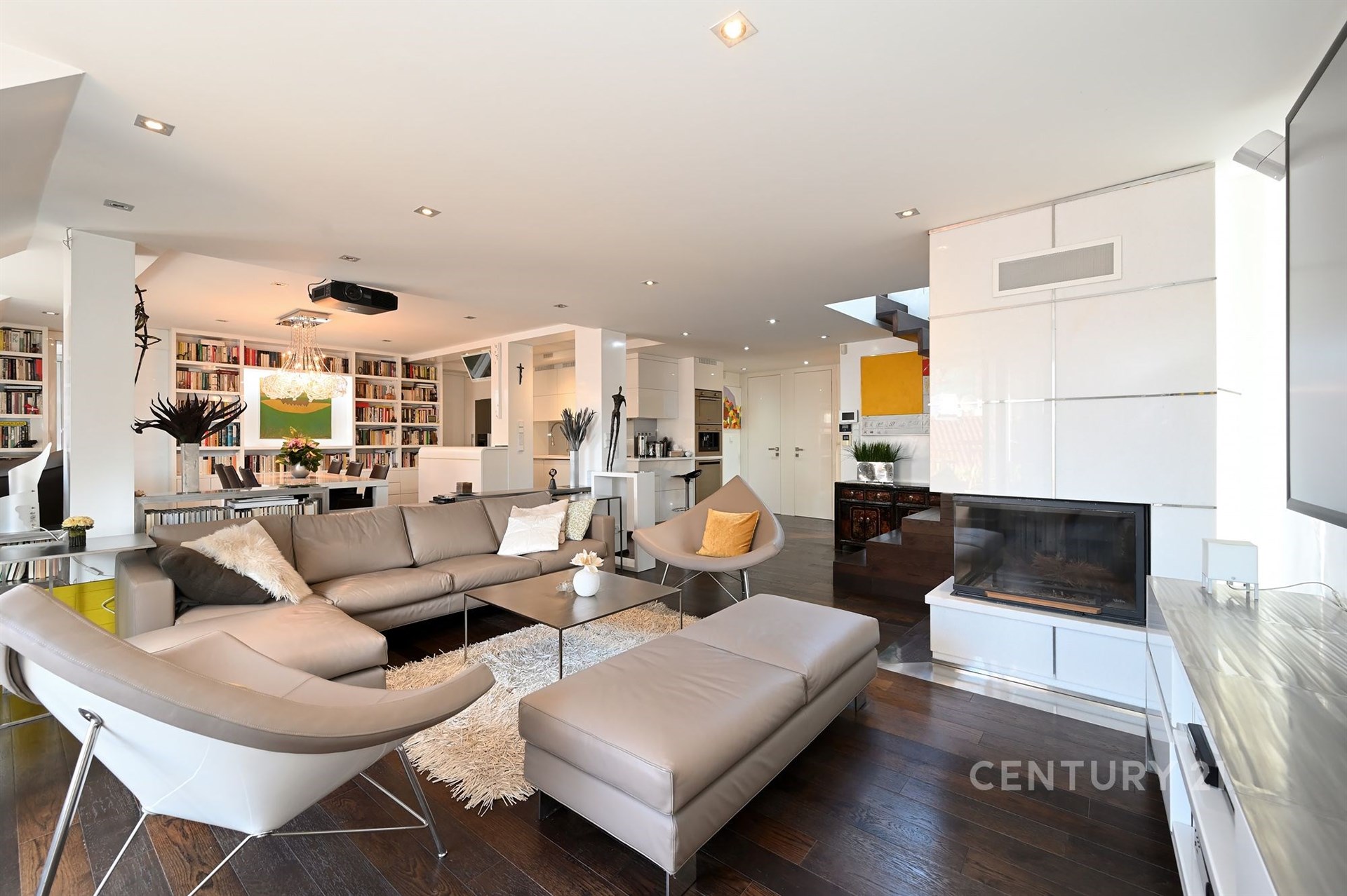 Široké schodiště s oknem a zabudovanými skříňkami na boty vede do hlavního a největšího prostoru bytu otevřené obývací haly s kuchyňským koutem. Technická místnost s oknem je vybavena pračkou, plynovým kotlem Vailant a skladovacími prostory. Vedle ní je samostatné WC s oknem pro hosty a velká koupelna se dvěma okny, masážní vanou, sprchovacím koutem, umyvadlem a WC se zabudovaným bidetem. Koupelna je vybavena reproduktory z dalšího audio systému a menší televizí na zdi.
