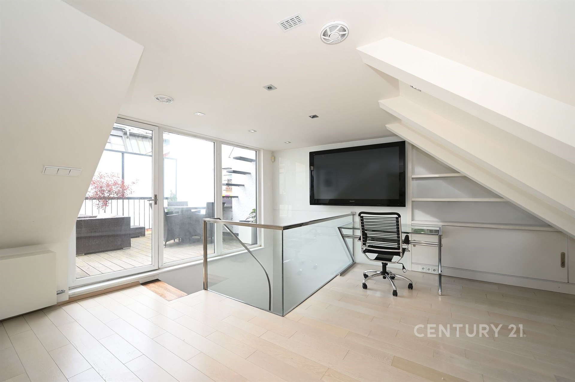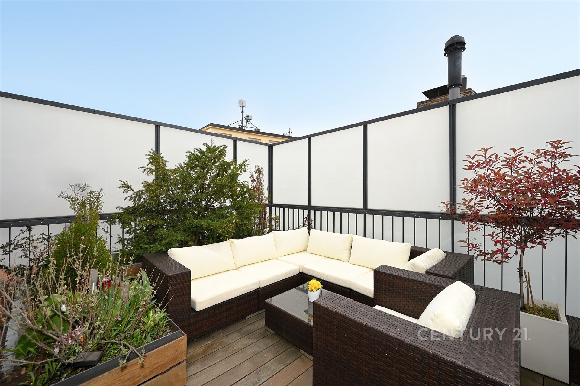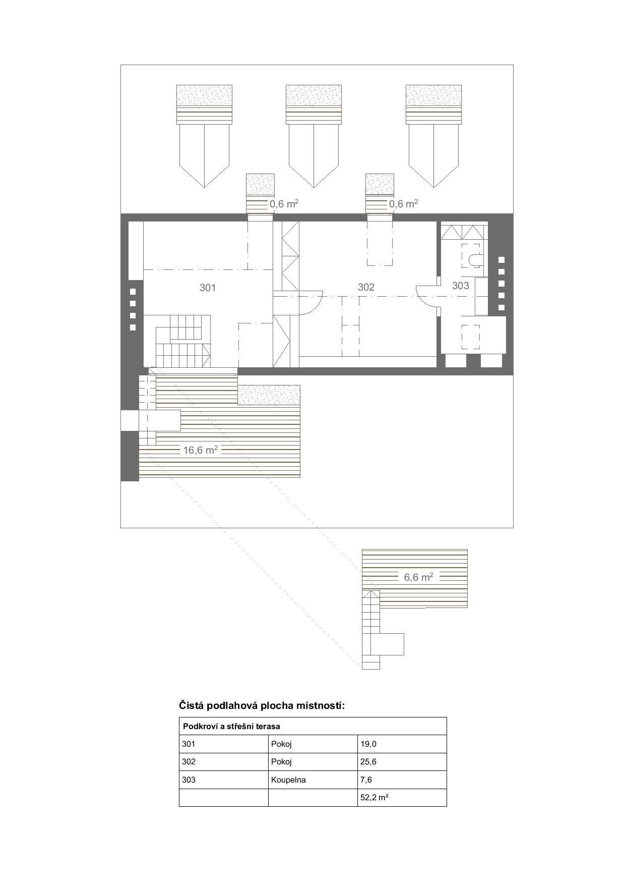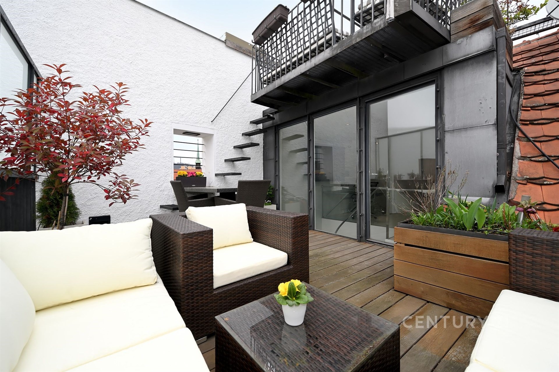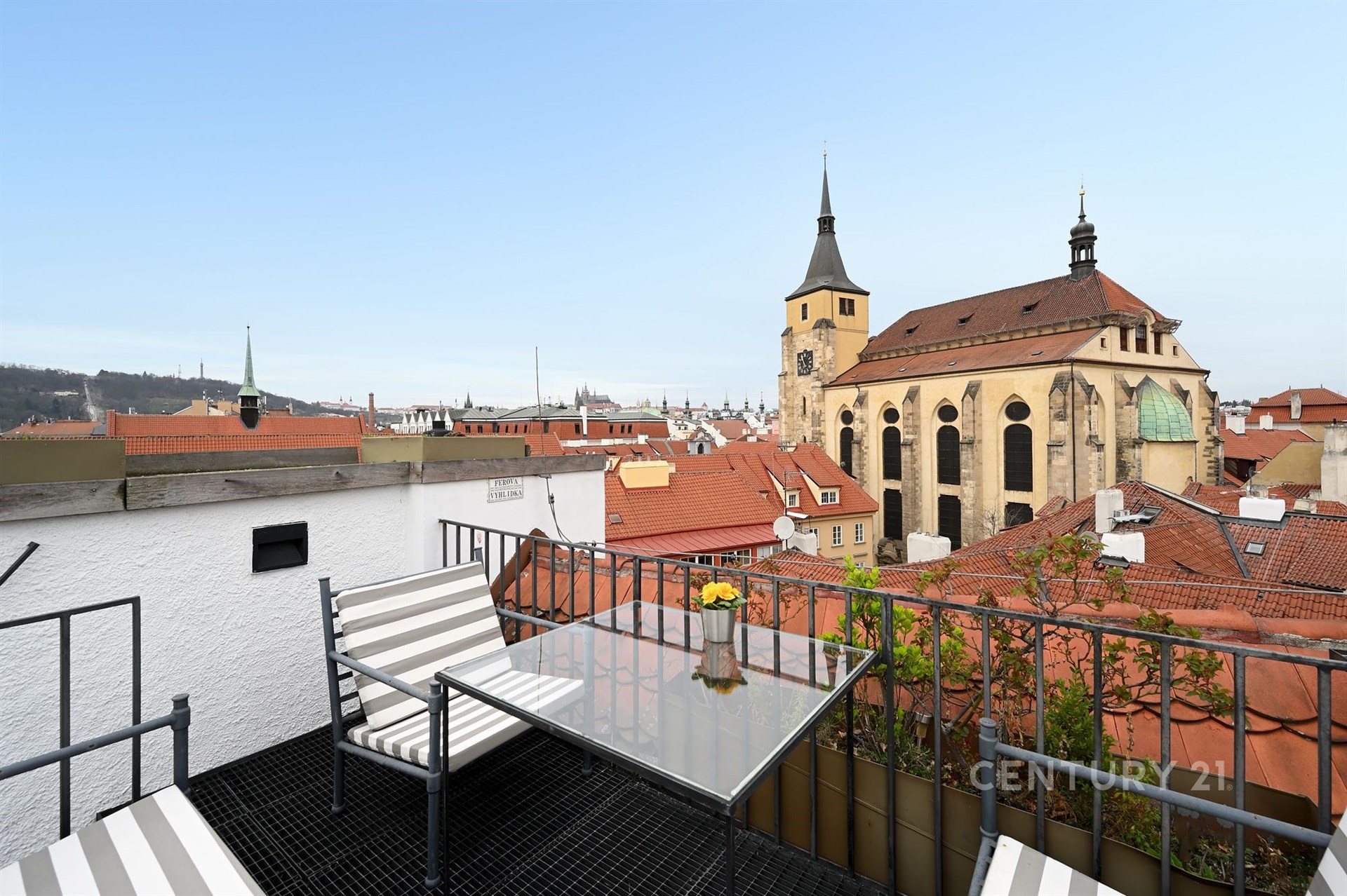Část obývacího pokoje je otevřena až ke střeše, kde se nachází dva další pokoje. Jeden slouží jako pokoj pro hosty s vlastní koupelnou, druhý jako pracovna s balkonem a vstupem na prostornou terasu s letní sedačkou, zabudovaným kamenným stolem a vzrostlou zelení. Nad touto terasou je další terasa s panoramatickým výhledem na celou starou Prahu.
