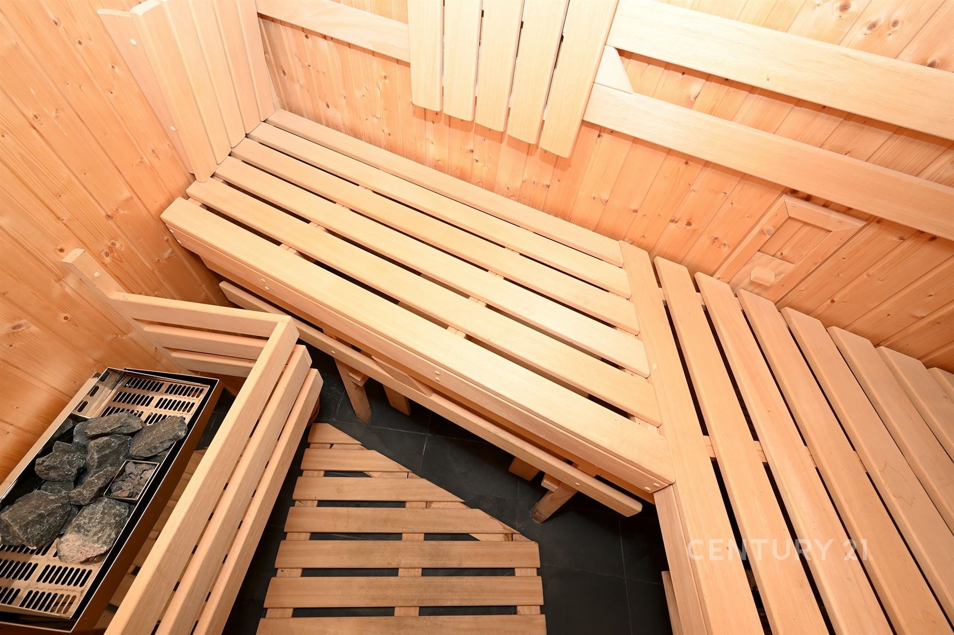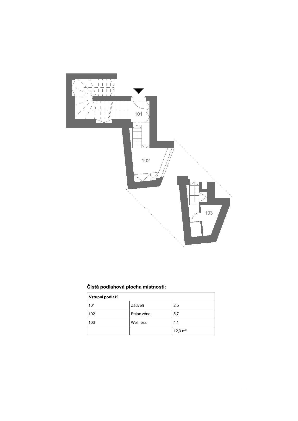 Vstup do bytu je ve 2. patře domu. Předsíň je vybavena vestavěnou skříní na oblečení. Několik schůdků vede k sauně pro dvě osoby, úložnému prostoru pro saunovací potřeby a sprchovacímu koutu. Nad saunou se nachází odpočinkový prostor s prosklenou zdí do dvora, pohodlnými křesly a další velkou vestavěnou skříní. K dispozici je audio systém s reproduktory v tomto prostoru a také v sauně.