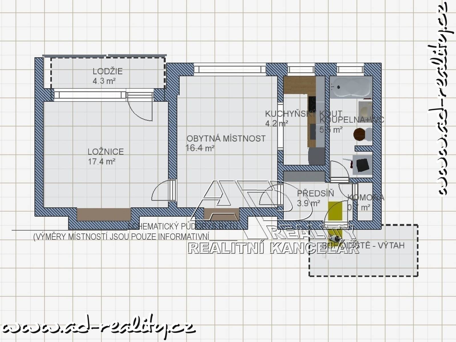 Dispozice bytu: obývací pokoj [16,4m2], kuchyňský kout [4,2m2], pokoj/ložnice [17,4m2] s lodžií [4,3m2], předsíň [4,6m2] a koupelna s WC [5,4m2]. K bytu je k dispozici sklepní kóje v 1.PP (suterén) domu o výměře cca [1,8m2]. Topení v bytě centrální / ústřední dálkové (podlahové), podružné měření spotřeby teplé a studené vody (vodoměry), samostatné měření spotřeby elektřiny (elektroměr). V bytě je možnost připojení internetu a STA.