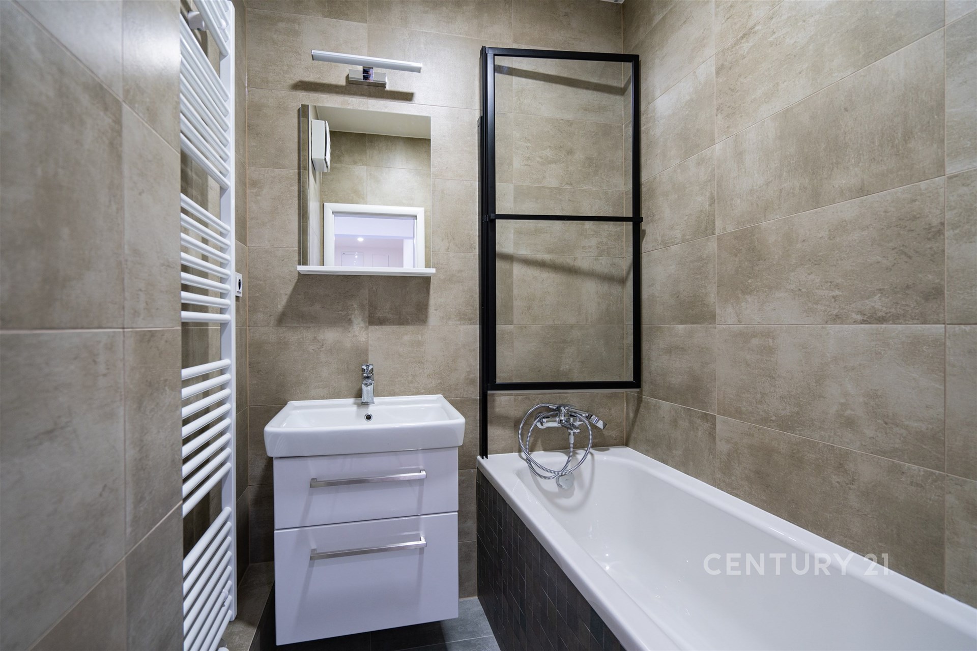 V koupelně je umístěna velká vana obložená stylovou mozaikou v antracitové barvě, kombinovaný topný žebřík (mimo topnou sezonu je možní připojení do zásuvky), umyvadlo se skříňkou a zrcadlem, nechybí pneumatická vanová zástěna, pomocí které během několika vteřin máte možnost vytvořit sprchový kout, mimo centrálního osvětlení je v koupelně samostatné osvětlení nad zrcadlem a samostatné osvětlení nad vanou.