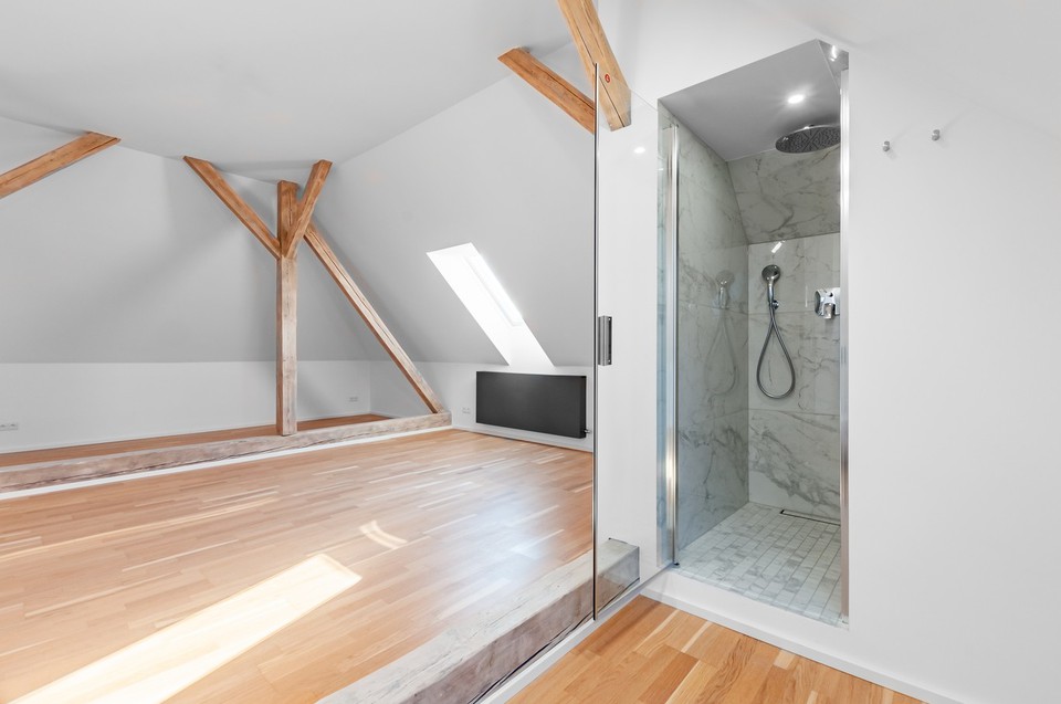 Dispozice zahrnuje 4 podlaží, v 1. podlaží vstupní chodba, velkorysý otevřený prostor obývacího pokoje s jídelnou a plně vybavenou kuchyní (montáž bude probíhat v lednu 2022) a přímým vstupem na nově vybudovanou prostornou terasu s přístupem do zahrady, samostatná toaleta, ve 2. podlaží 2 pokoje s velkou samostatnou koupelnou s vanou a sprchovým koutem, další toaleta, 3.podlaží v obytném podkroví se zajímavě řešeným neohraničeným prostorem se zachovanými původními trámy po kompletní renovaci a zajímavě řešenou koupelnou, toaletou. Tato část domu vybízí k umístění relaxačního a spacího zázemí pro rezidenty – master bedrooms se sen suit koupelnou. V suterénu umístěno technické zázemím domu, včetně koupelny, toalety a dvou dalších pokojů s okny do zahrady.