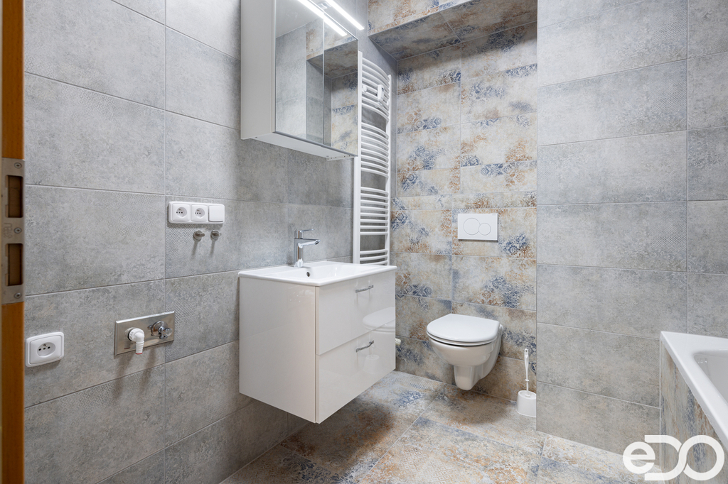 Koupelna je zařízena vanou a připravena na pračku. WC je součástí koupelny.