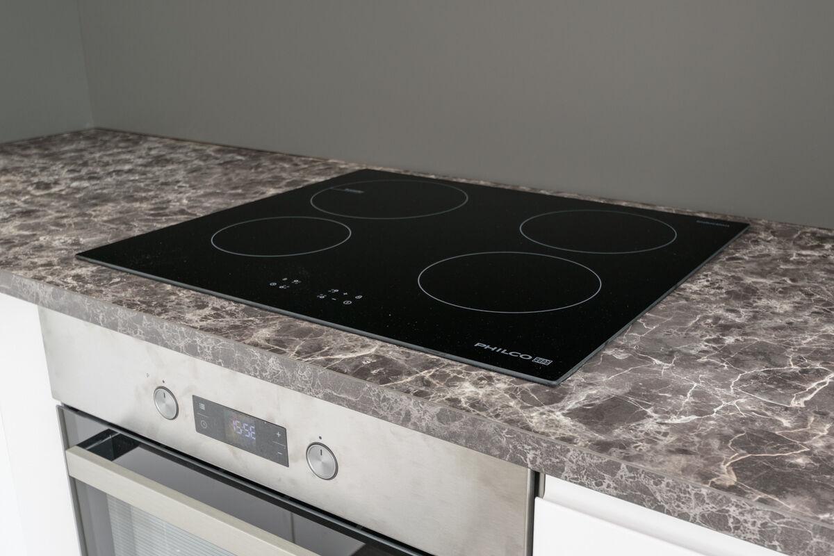 Byt je vybaven moderní kuchyňskou linkou se spotřebiči (myčka nádobí, varná deska, trouba, lednice, pračka)