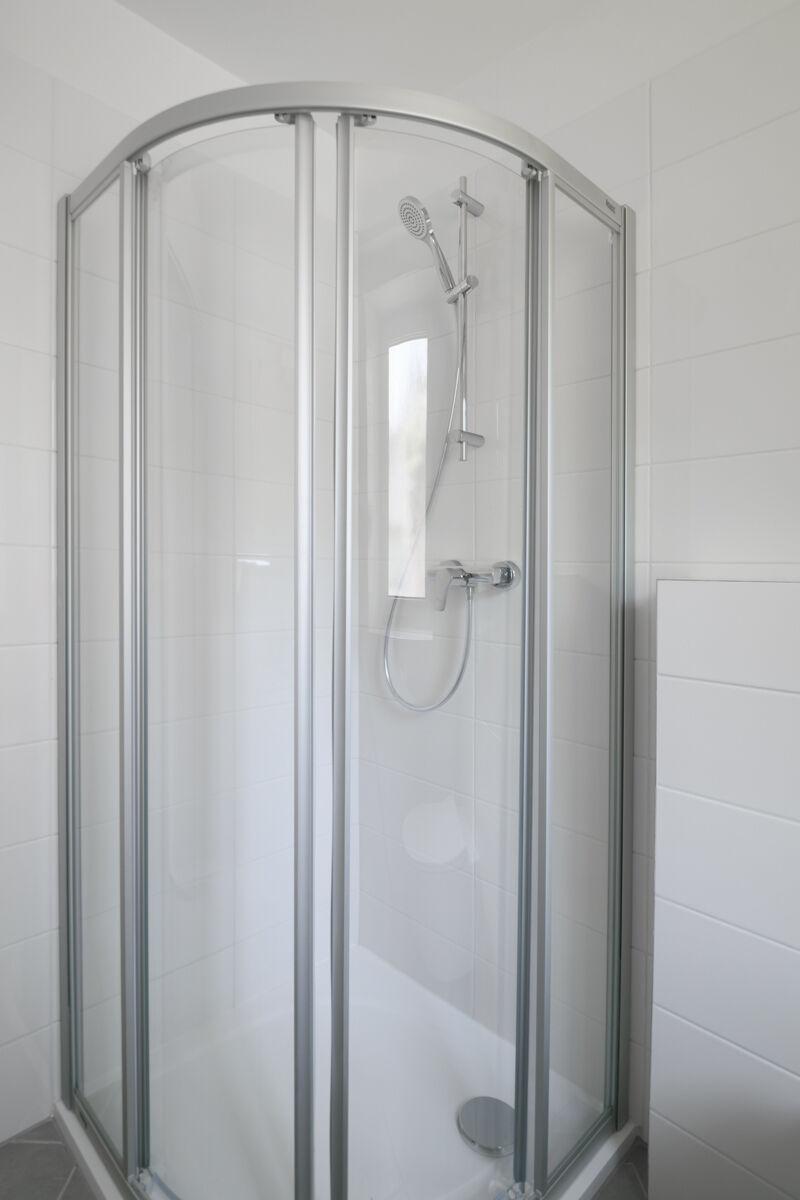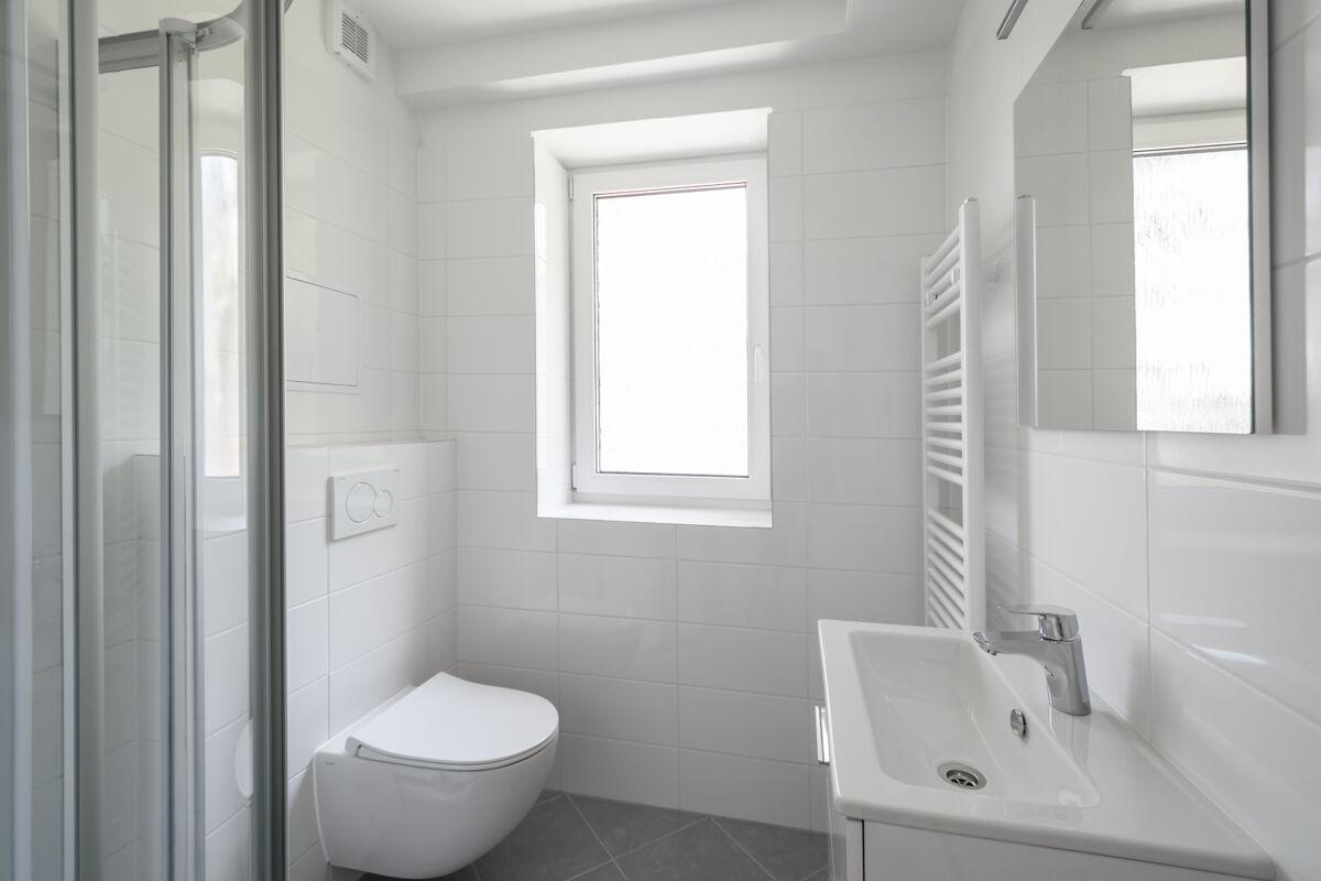 Koupelna je vybavena sprchovým koutem, umyvadlem a topným žebříkem.