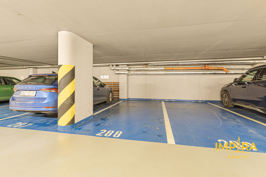 Vlastní garážové stání: Parkování v podzemních garážích přímo v domě je zahrnuto v nabídce.