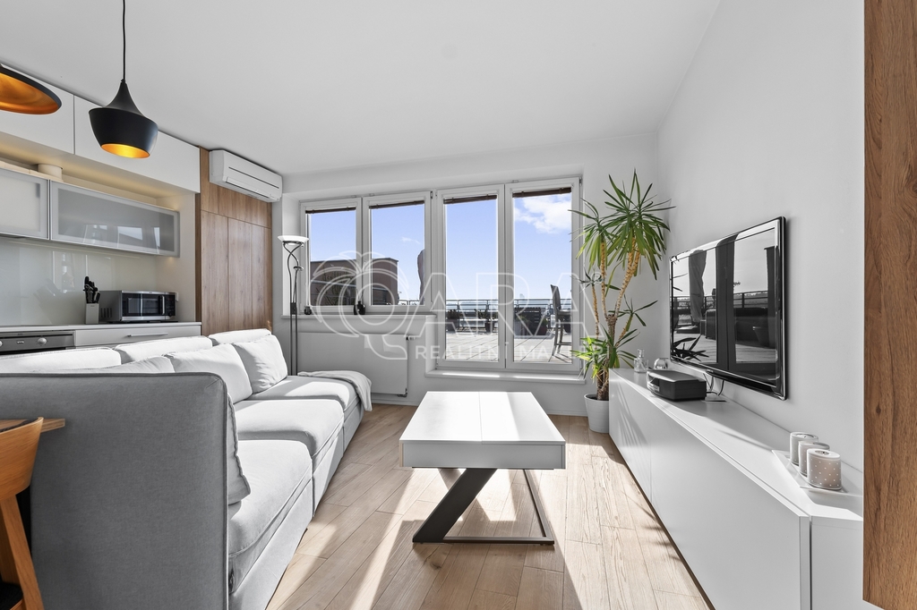 Terasa je vybavena velkou ratanovou sedačkou, slunečníkem, barem se židlemi a okrasnými keři. Terasa bytu je orientována na jih, pokoje mají okna na východ.