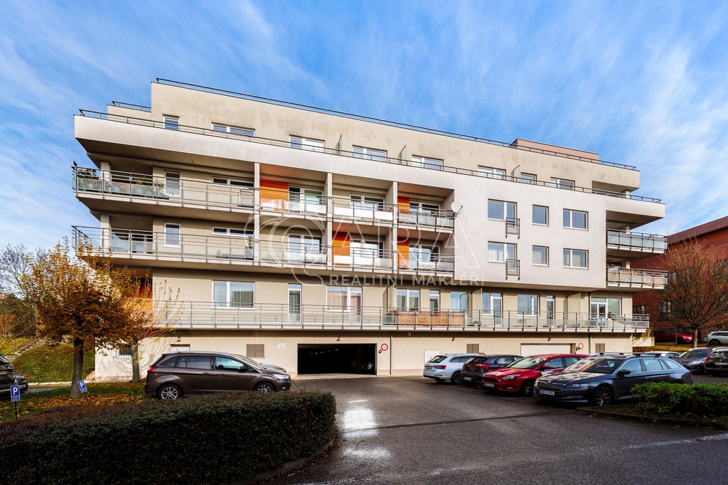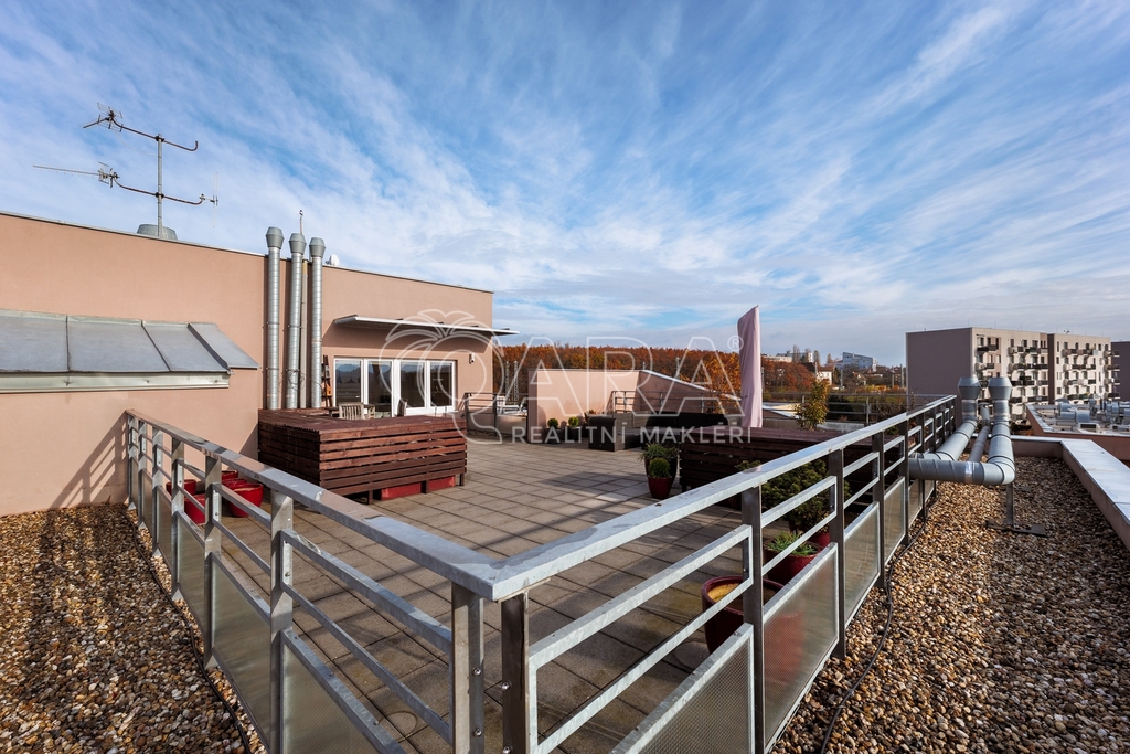 Nadstandardní byt nabízí podlahovou plochu 91 m², terasu o rozloze 100 m², sklep a možnost pronájmu dvou garážových stání.