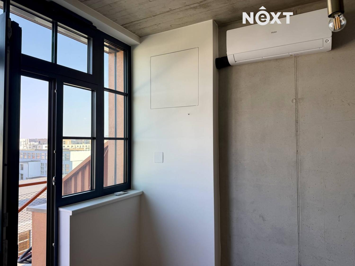 Světlý interiér s velkoformátovými okny a industriálními prvky vytváří osobitou atmosféru. Praktická dispozice 1+kk je doplněna balkonem vhodným pro posezení.