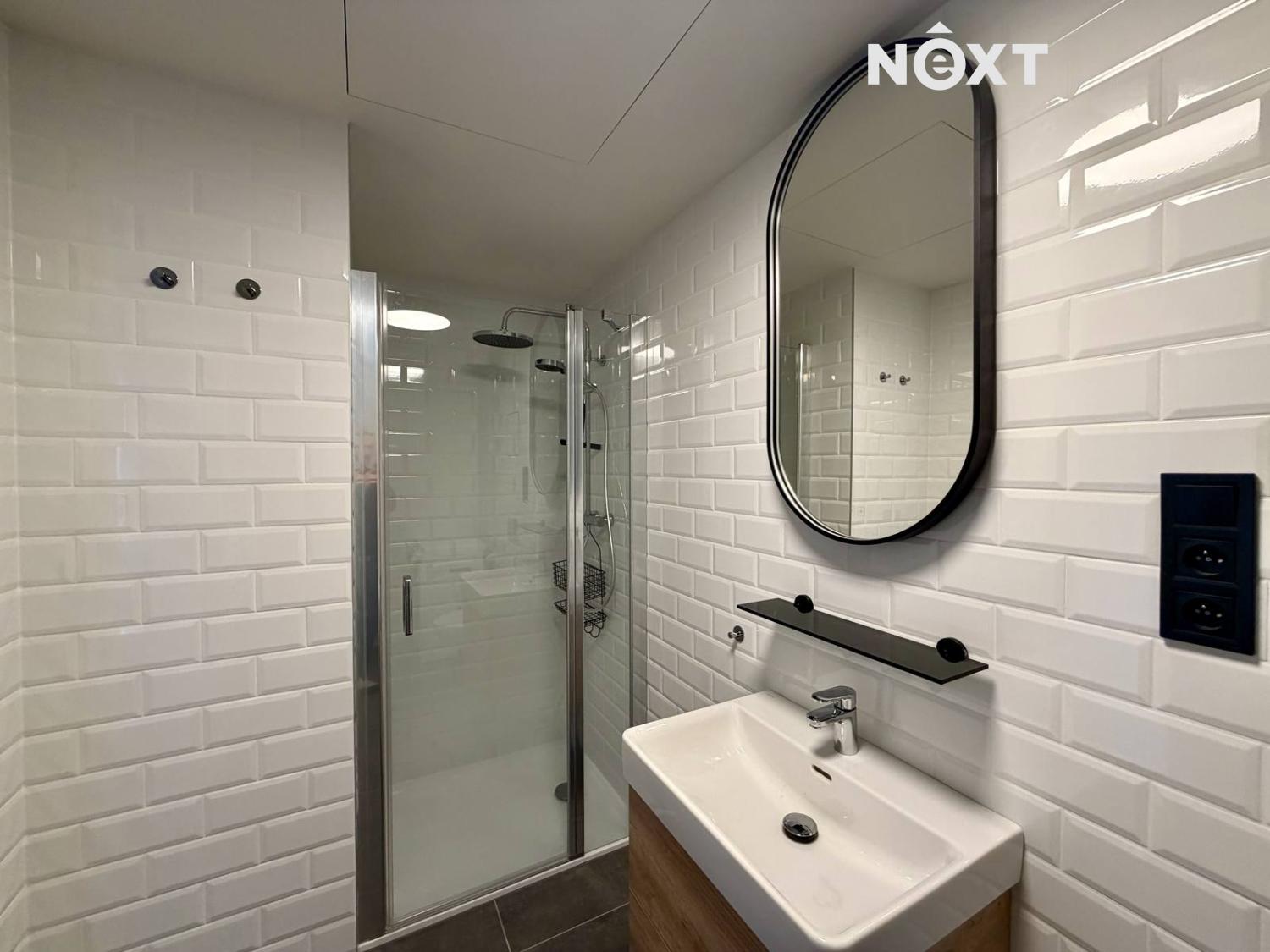 Moderní koupelna se sprchovým koutem, vybavená pračkou se sušičkou značky Haier.